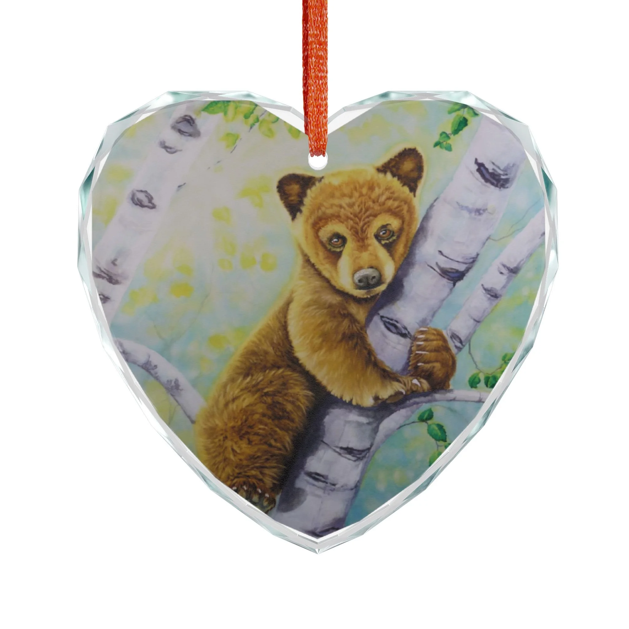 A faceted crystal glass ornament that catches light and warms the room with a soft woodland scene. The one-sided, casewrap print shows a baby bear clinging to birch trunks in gentle watercolor tones; the image shimmers through the clear crystal and reads softly from the reverse. Choose between a round or heart shape finished with a red hanging ribbon—an adult-only decorative piece made from 100% crystal glass. Hang it where morning sun or twinkle lights can refract through the edges, turning a quiet corner into a small, luminous moment.