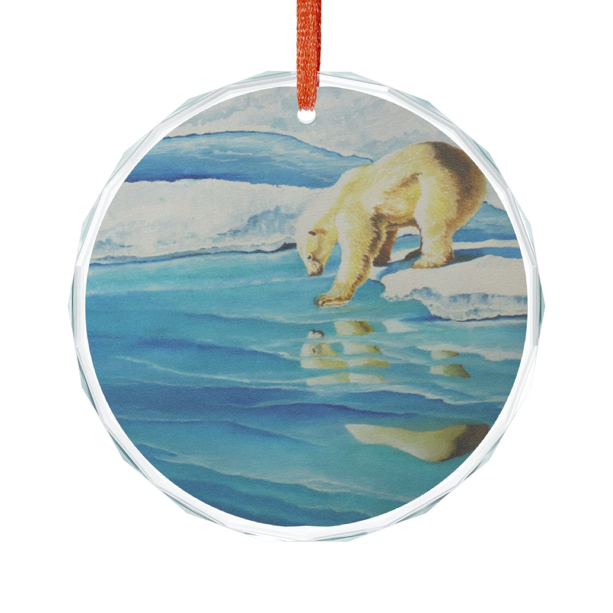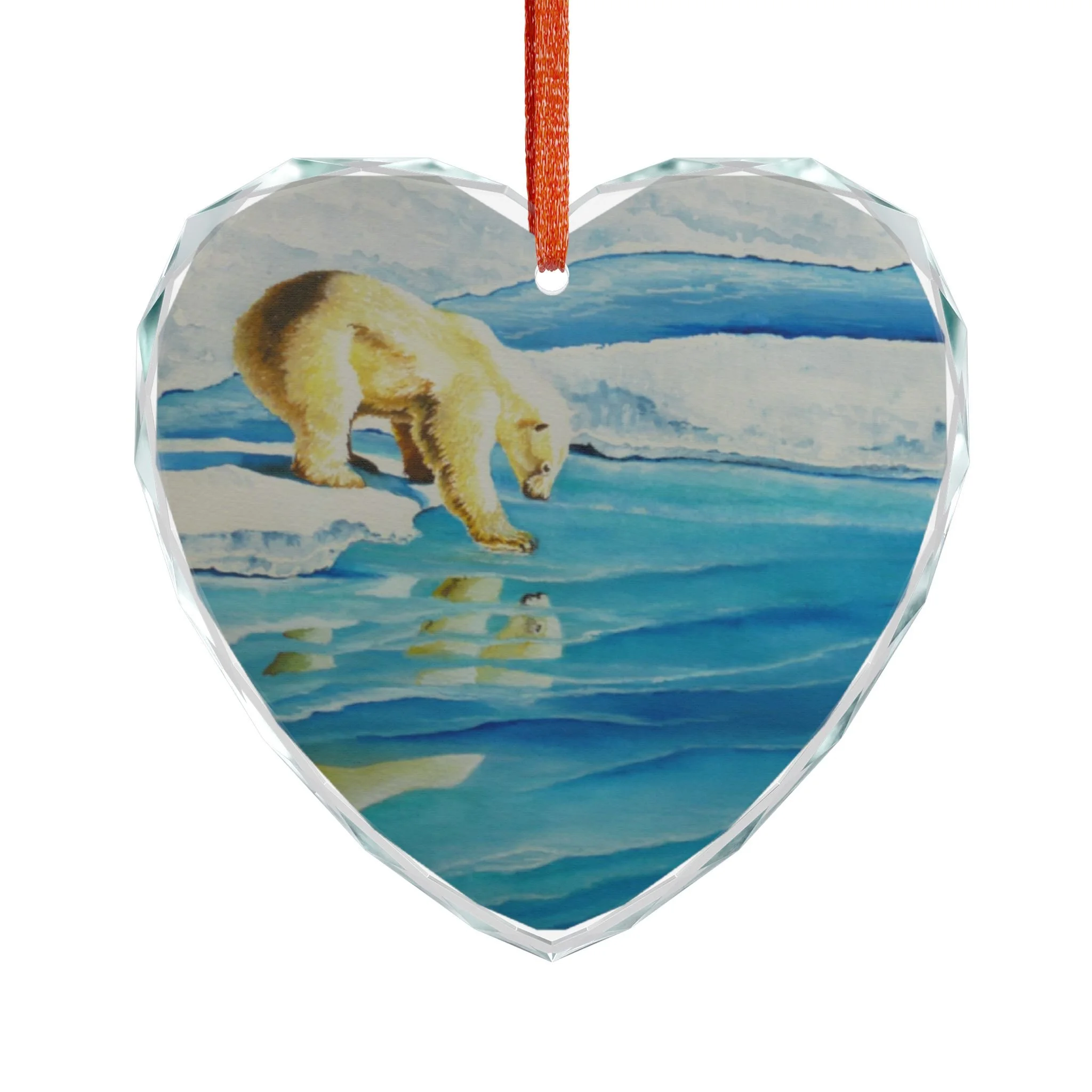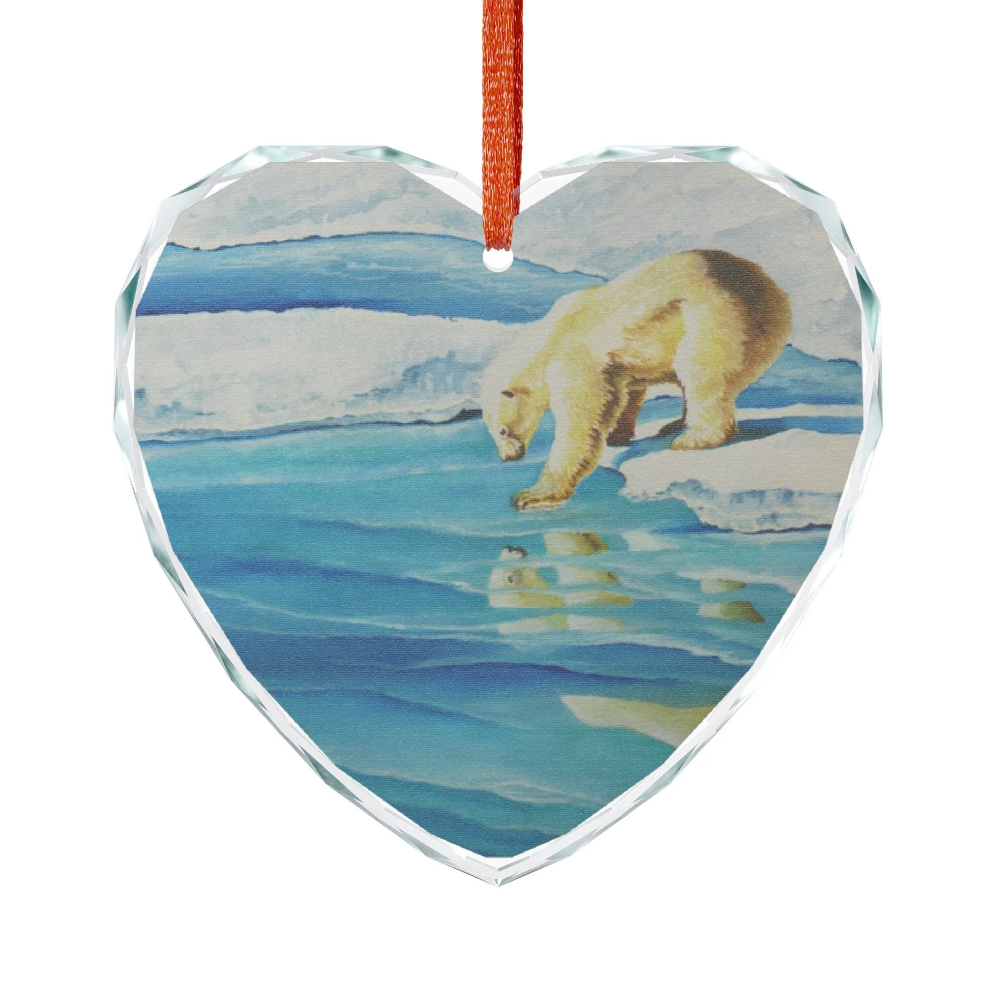 A delicate crystal glass ornament that captures a quiet Arctic moment — a polar bear pausing at the edge of fractured ice, its reflection shimmering beneath. Cut facets catch holiday lights and morning sun, scattering blue and aqua tones across the room. Choose the classic round or a tender heart shape; each piece is printed on one side so the image appears luminous through the crystal. Hung from the included red ribbon, it brings a cool, contemplative beauty to a tree, window, or mantel. Crafted for adults who appreciate wildlife art and tranquil seasonal décor, this ornament feels like a small keepsake from the far North — calm, reflective, and quietly elegant.