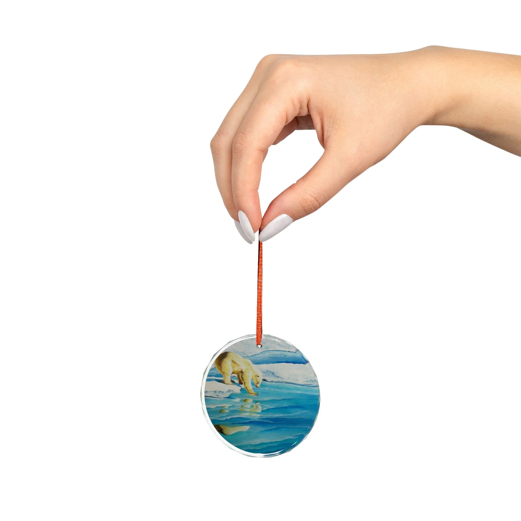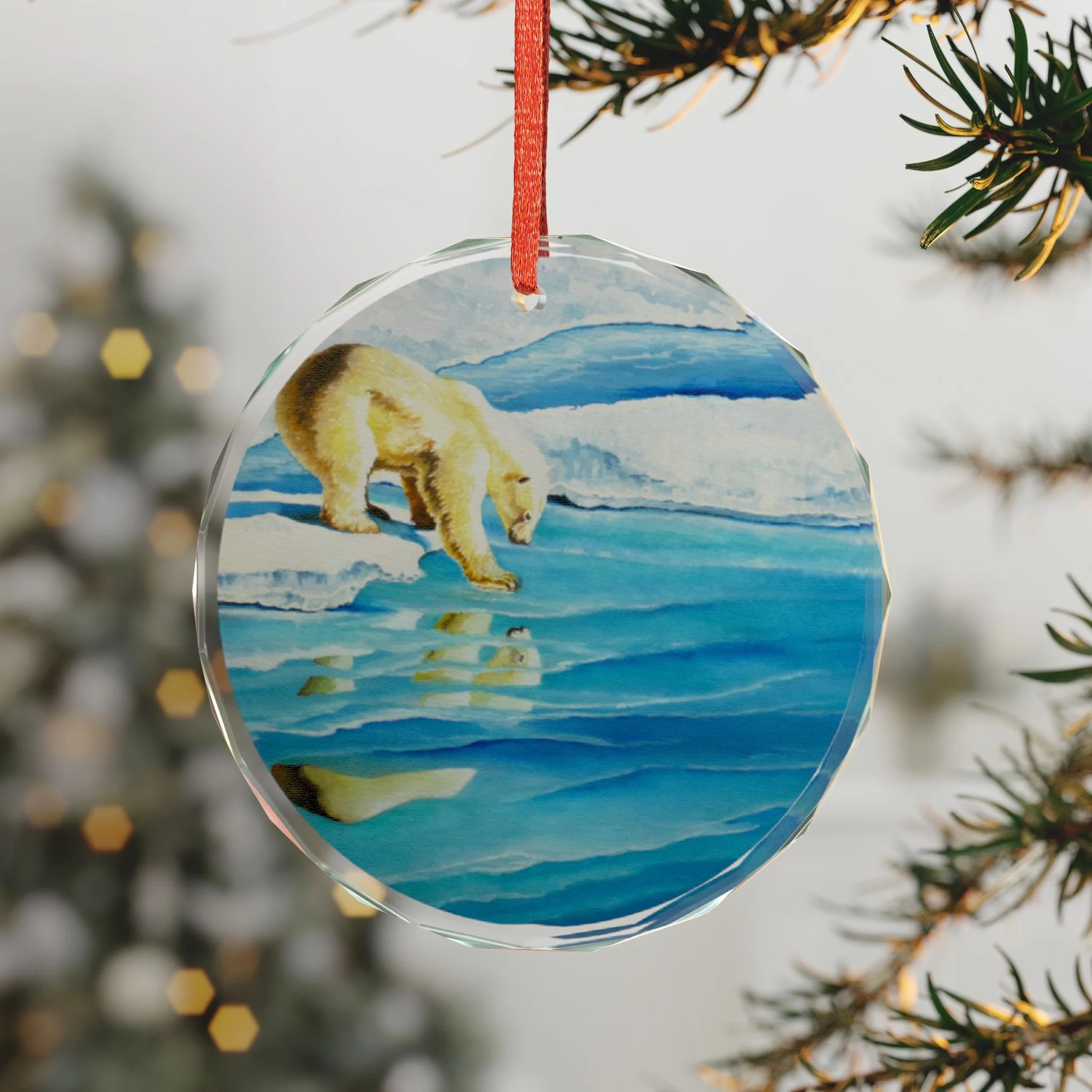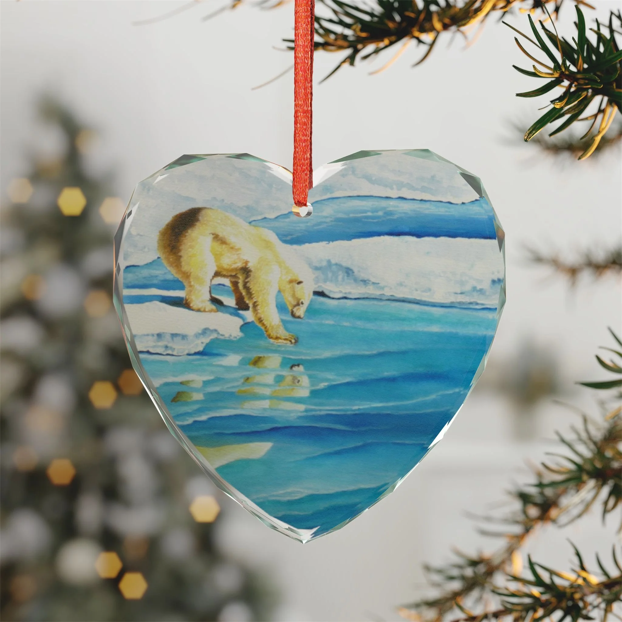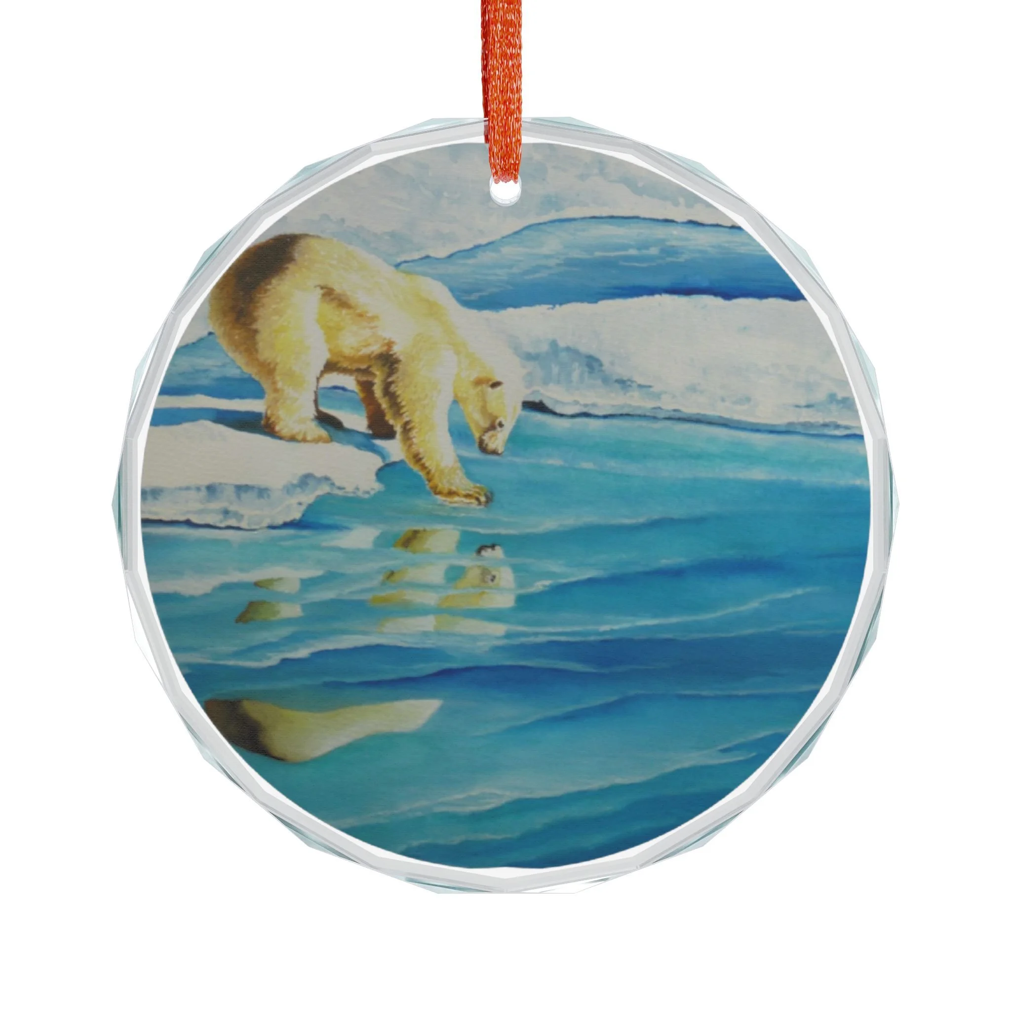 A delicate crystal glass ornament that captures a quiet Arctic moment — a polar bear pausing at the edge of fractured ice, its reflection shimmering beneath. Cut facets catch holiday lights and morning sun, scattering blue and aqua tones across the room. Choose the classic round or a tender heart shape; each piece is printed on one side so the image appears luminous through the crystal. Hung from the included red ribbon, it brings a cool, contemplative beauty to a tree, window, or mantel. Crafted for adults who appreciate wildlife art and tranquil seasonal décor, this ornament feels like a small keepsake from the far North — calm, reflective, and quietly elegant.