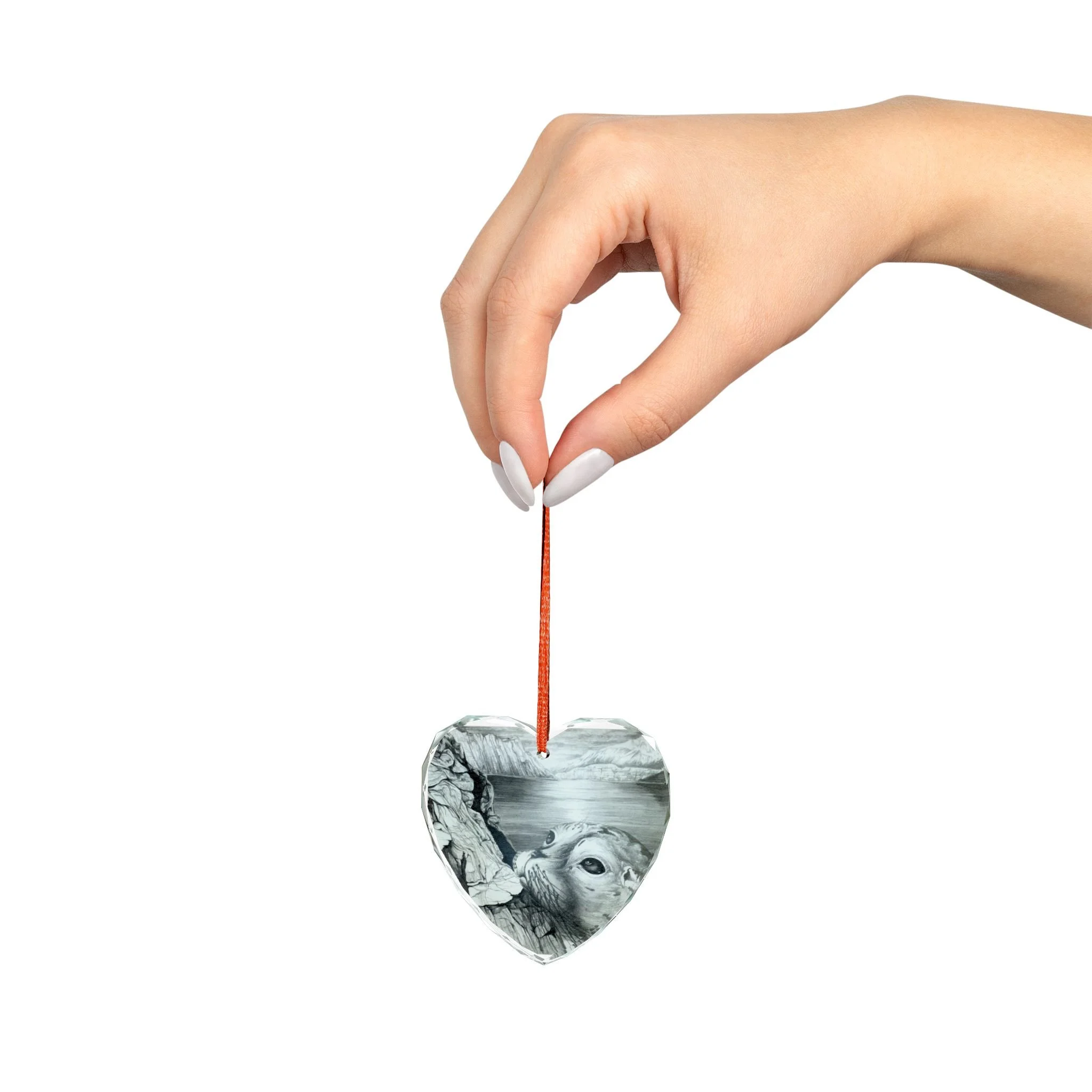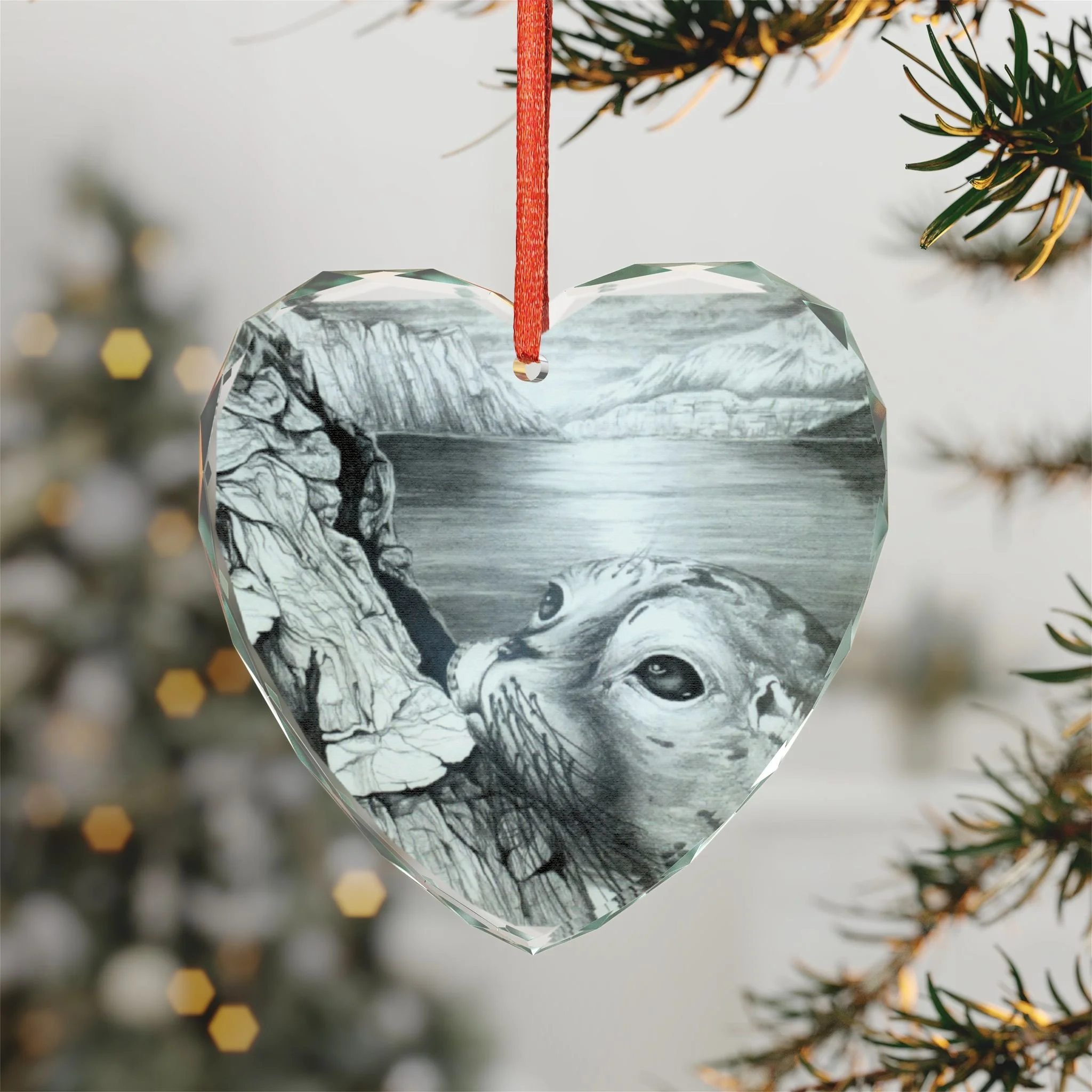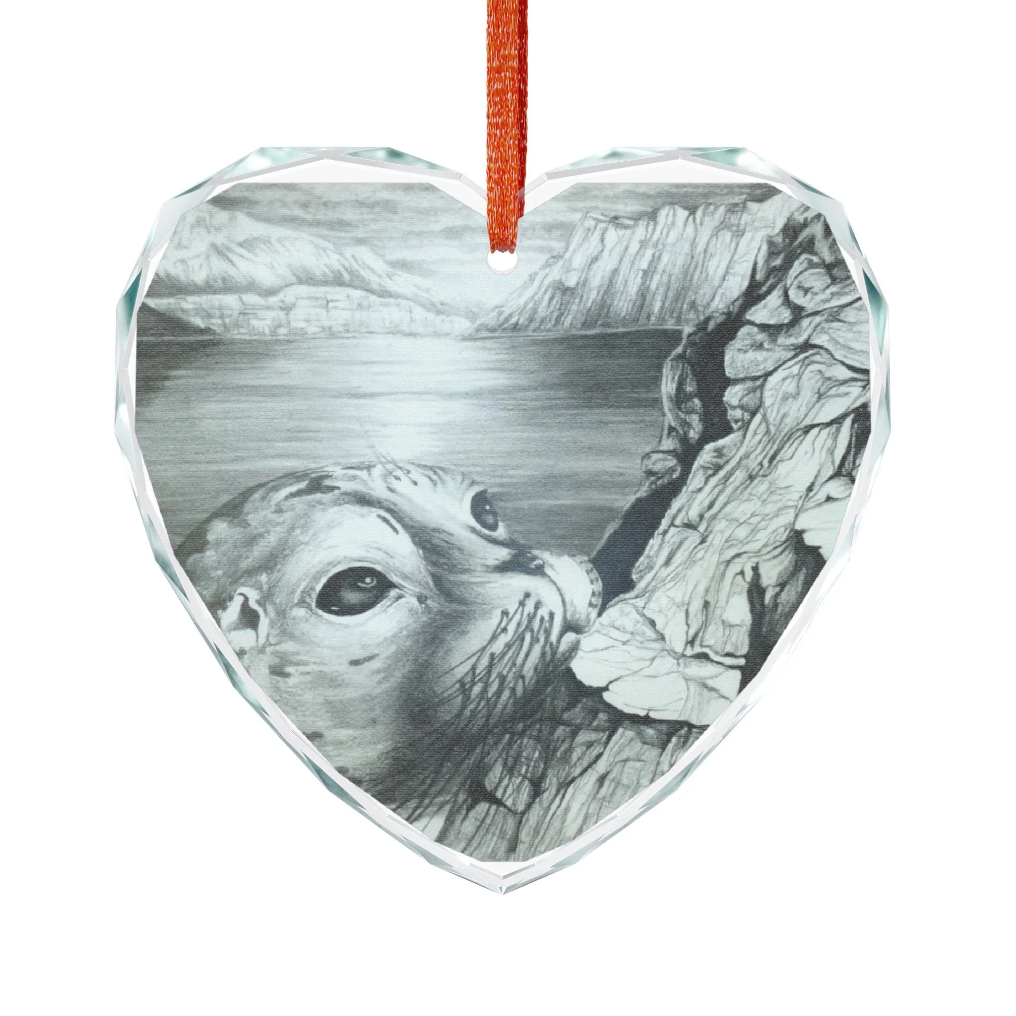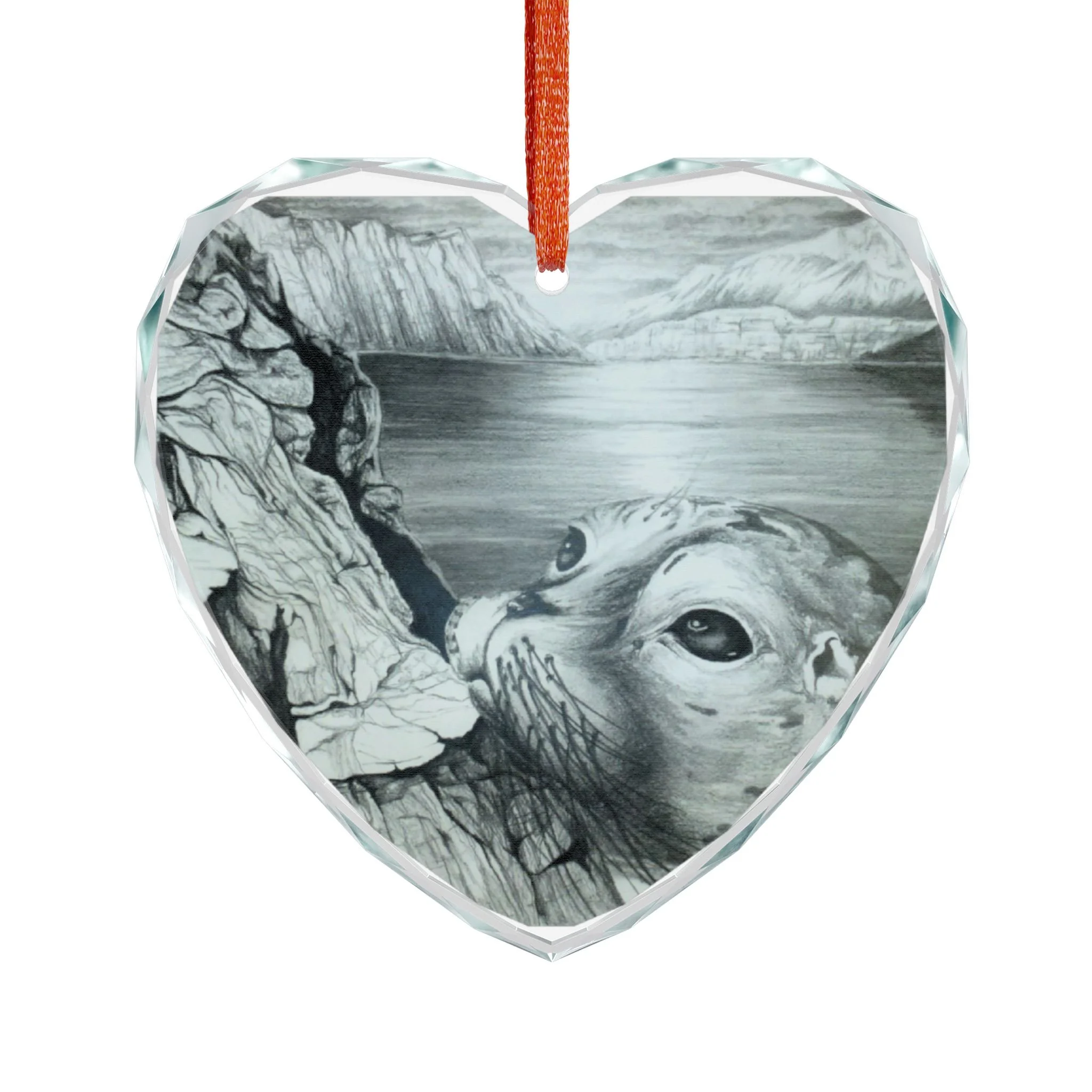 A hand-faceted crystal glass ornament that catches light and holds a quiet moment. The design shows a softly rendered seal pup resting against driftwood with a calm sea and low horizon behind — a small coastal scene frozen in faceted glass. Hung by the included red ribbon, the ornament throws gentle rainbows and subtle reflections through a casewrap finish that enhances depth and clarity. It’s crafted from 100% crystal glass and offered in round or heart shapes; the one-sided print appears subtly visible from the reverse, giving the image a soft doubled look. Place it in a sunny window, on a seasonal branch, or tucked into a keepsake display to evoke shoreline tranquility and a personal connection to the sea.