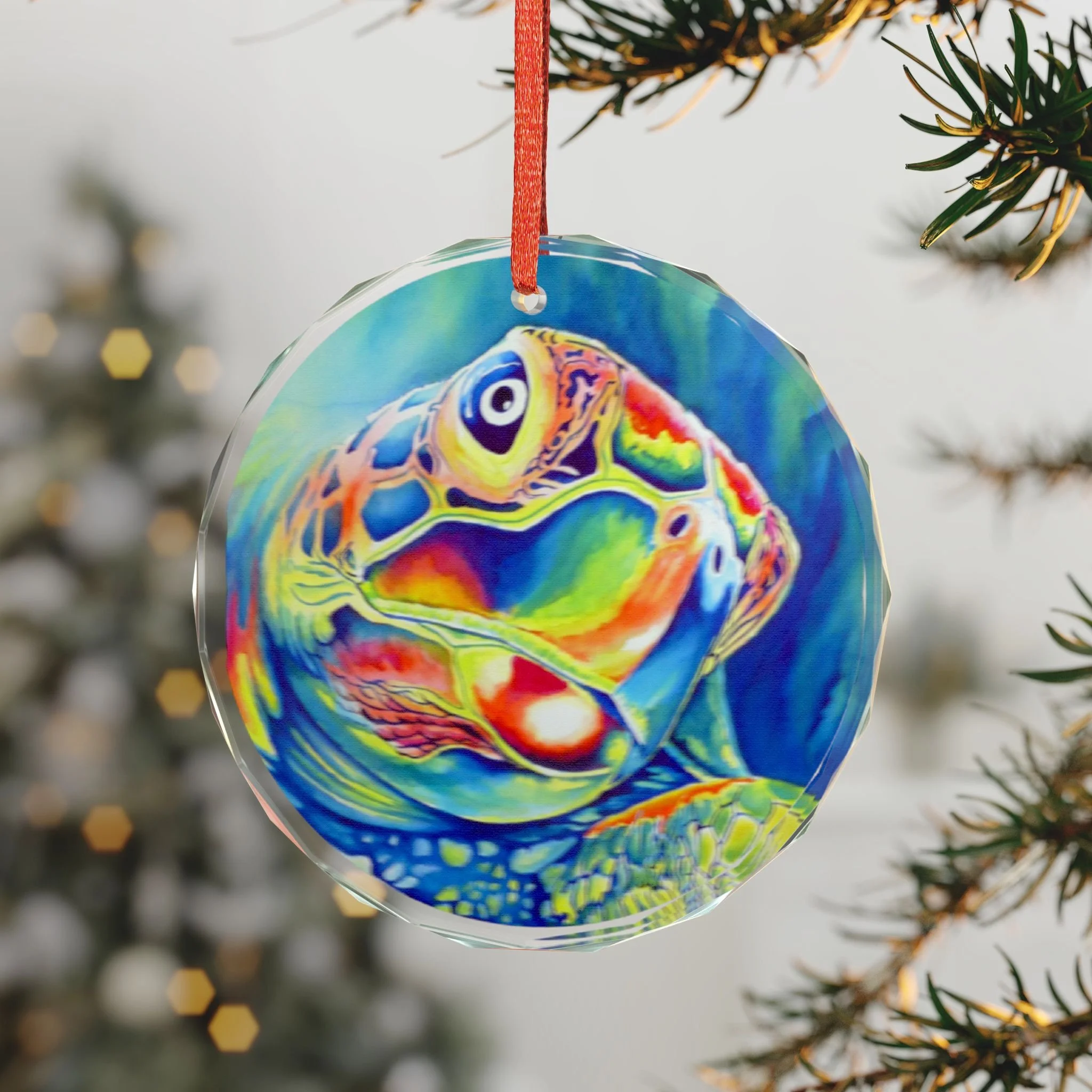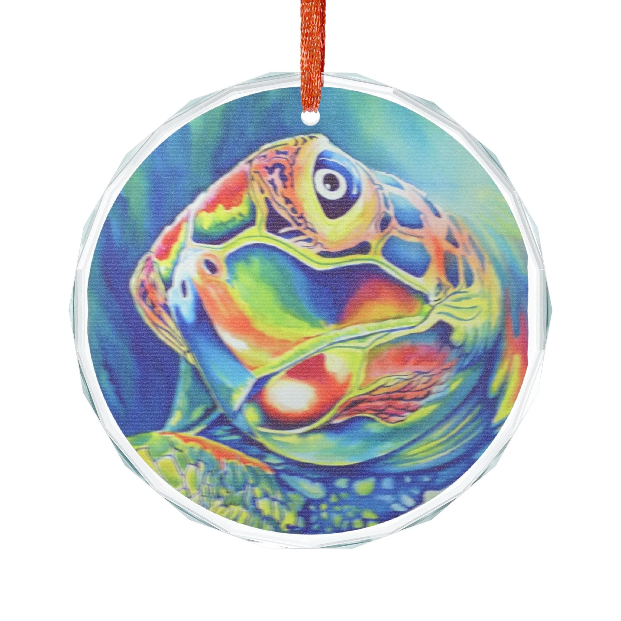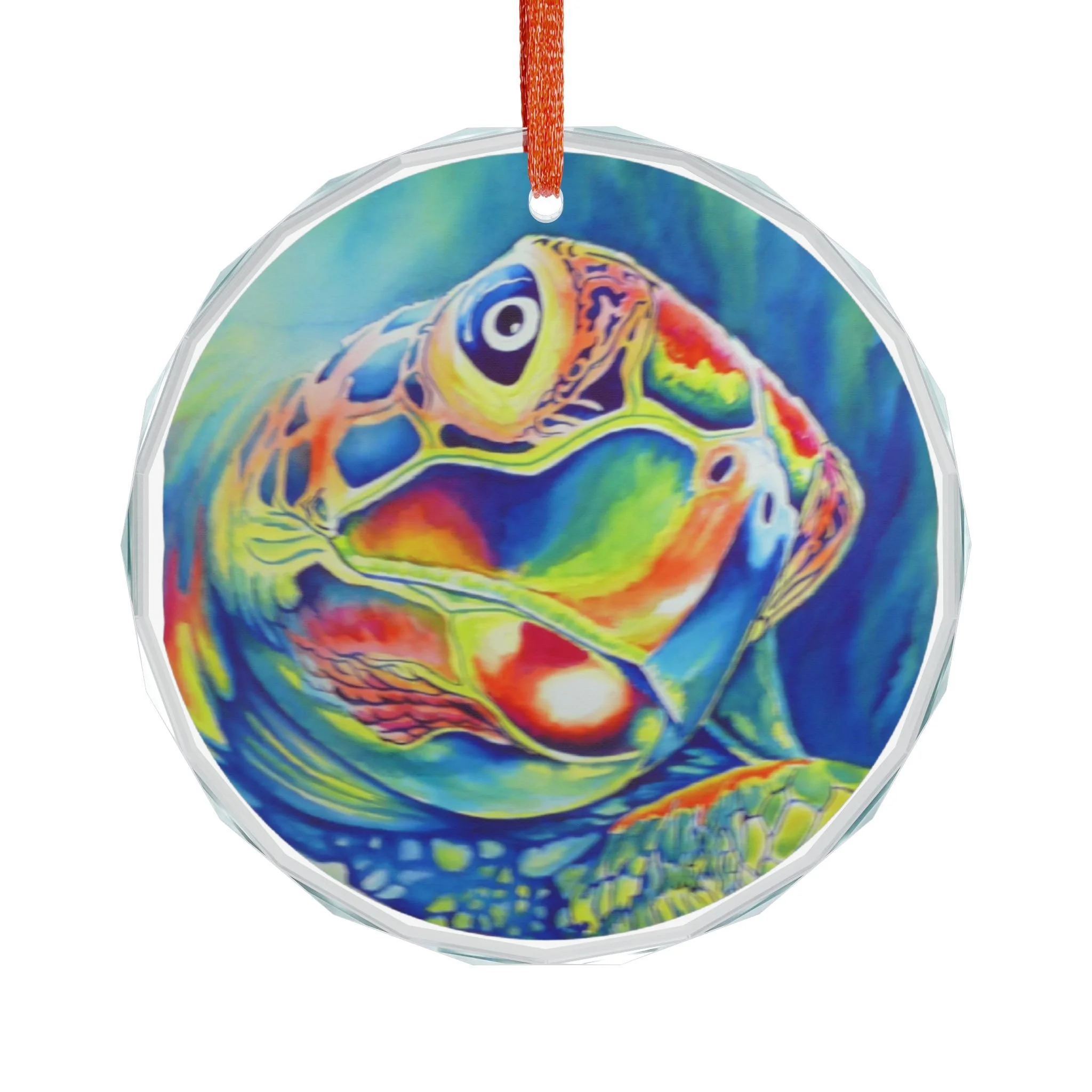 A luminous crystal glass ornament that captures a vibrant, underwater moment. Faceted edges catch and scatter light, while the one-sided art—visible from the reverse—features a colorful, stylized sea turtle in electric blues, greens, and warm accent hues. Hung by a red ribbon, the ornament reads like a tiny window into coral reefs and sunlit shallows. It brings a touch of marine wonder to mantels, windows, or a curated holiday tree, and feels right at home with beach-inspired décor or a collection of ocean keepsakes.