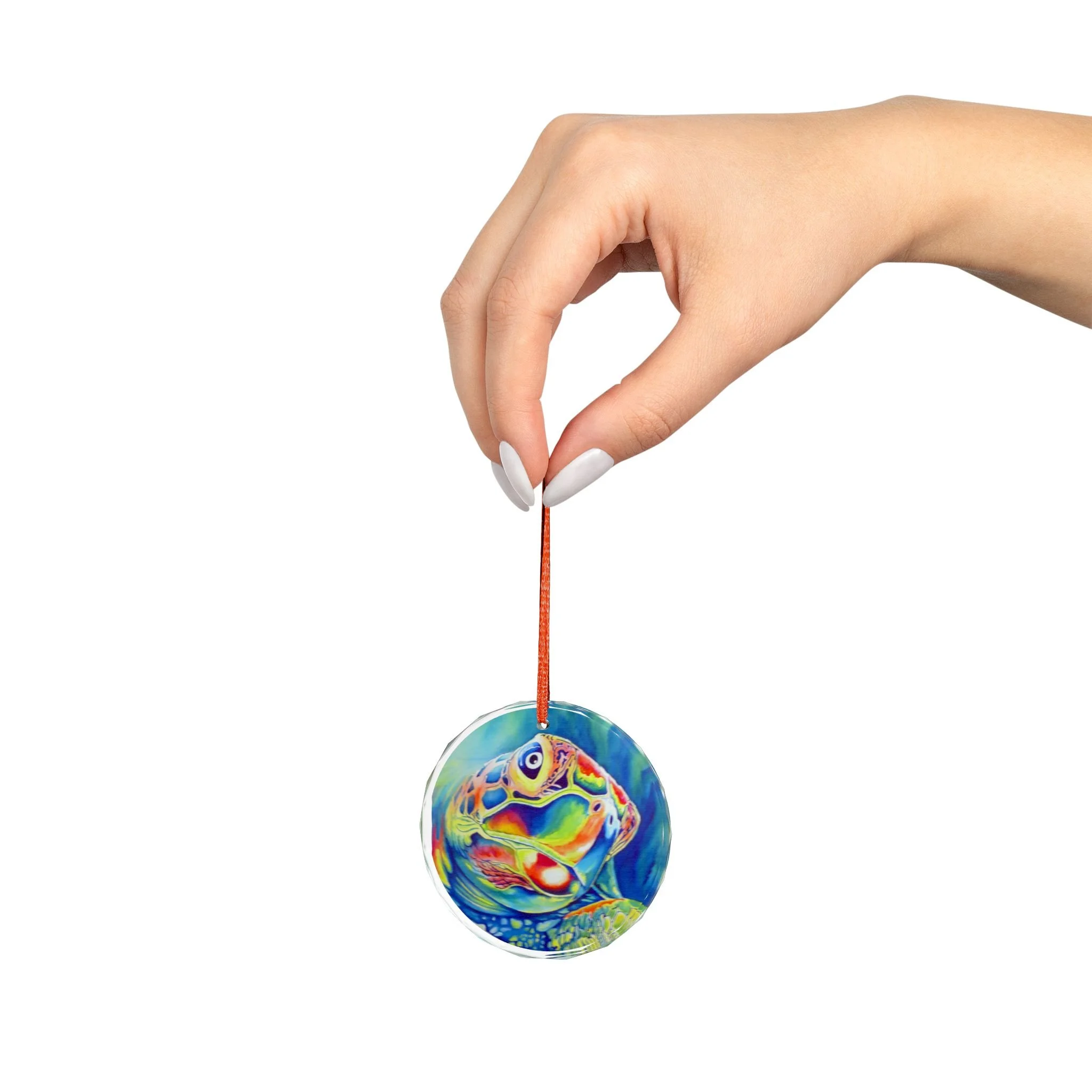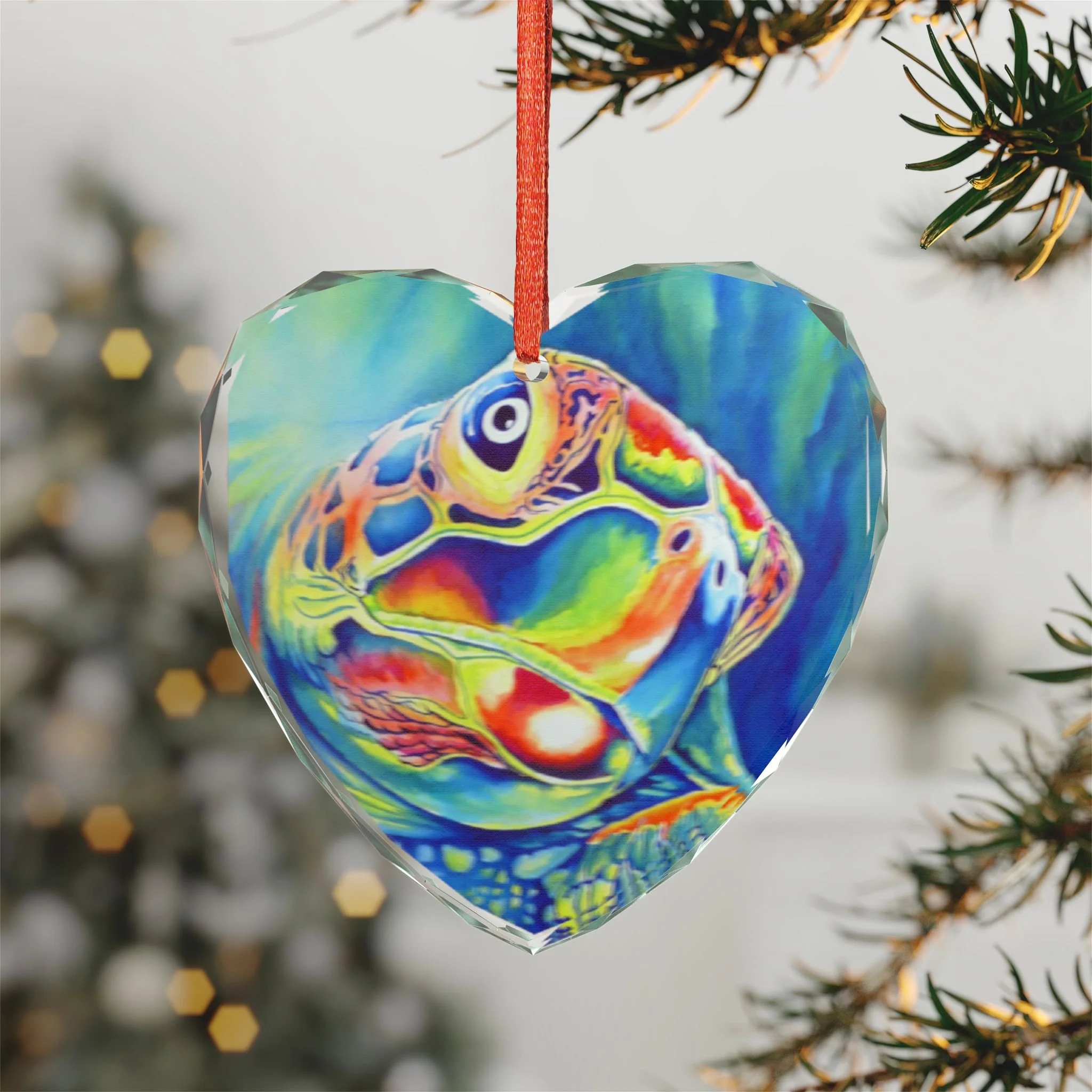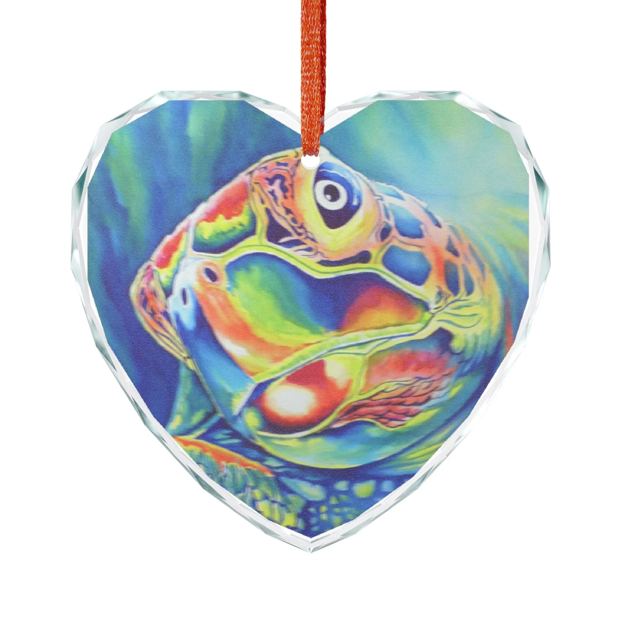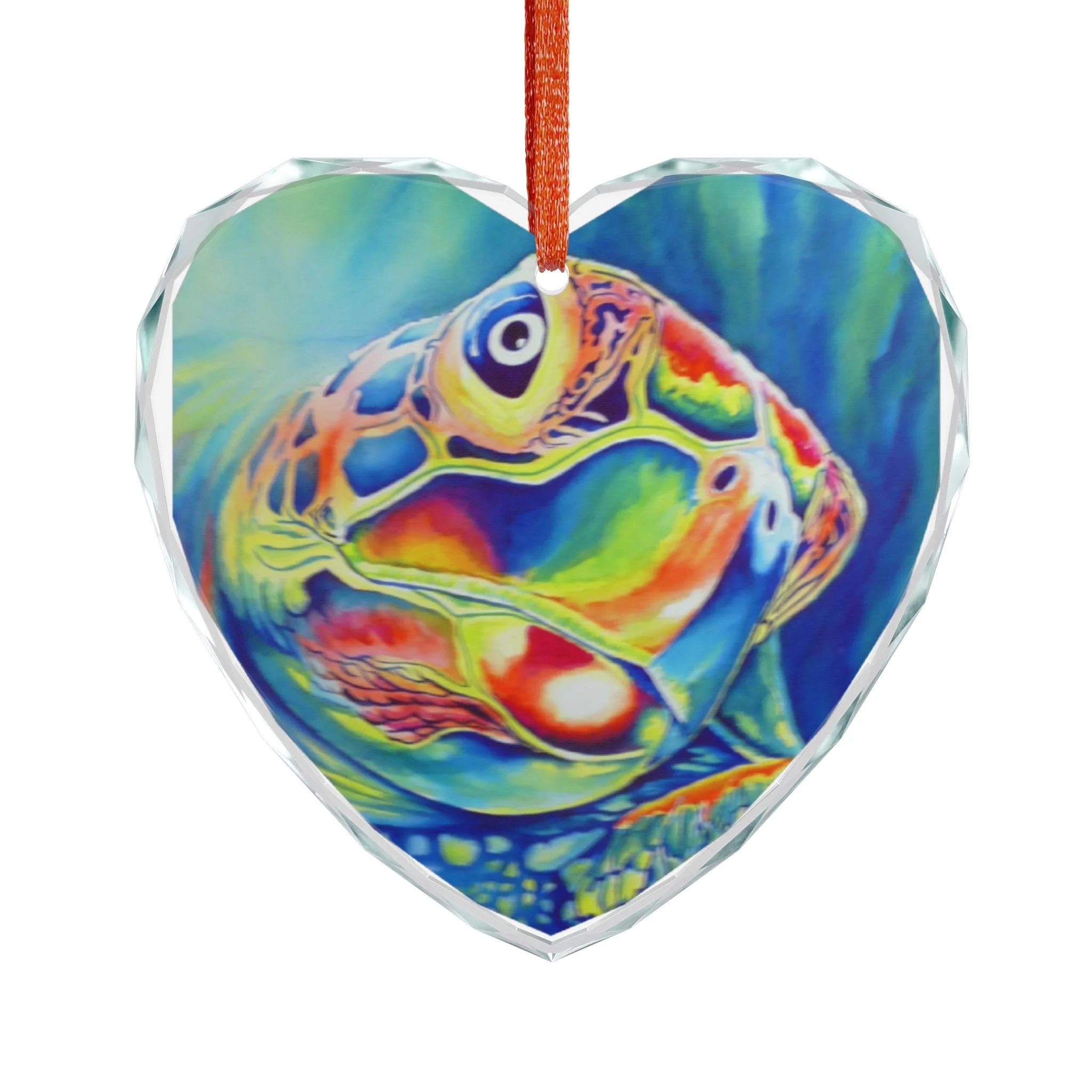 A luminous crystal glass ornament that captures a vibrant, underwater moment. Faceted edges catch and scatter light, while the one-sided art—visible from the reverse—features a colorful, stylized sea turtle in electric blues, greens, and warm accent hues. Hung by a red ribbon, the ornament reads like a tiny window into coral reefs and sunlit shallows. It brings a touch of marine wonder to mantels, windows, or a curated holiday tree, and feels right at home with beach-inspired décor or a collection of ocean keepsakes.