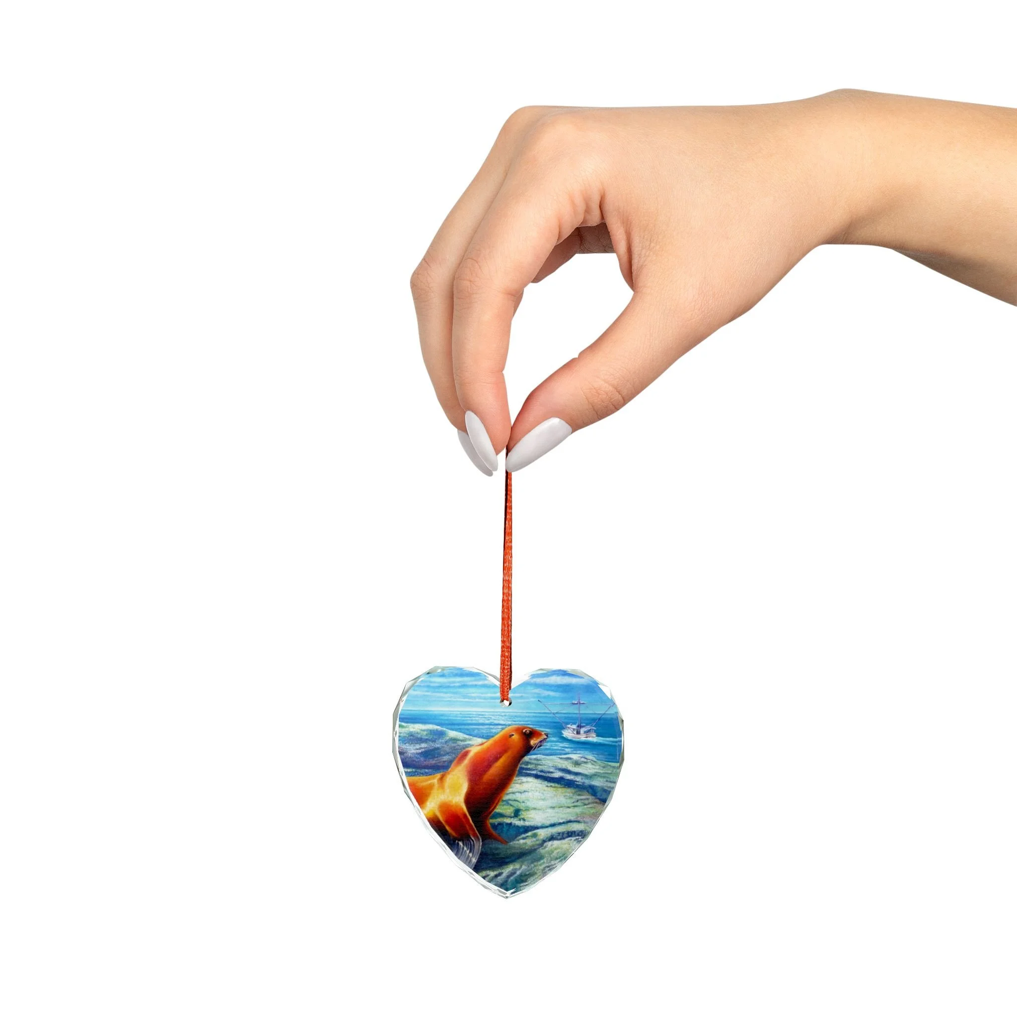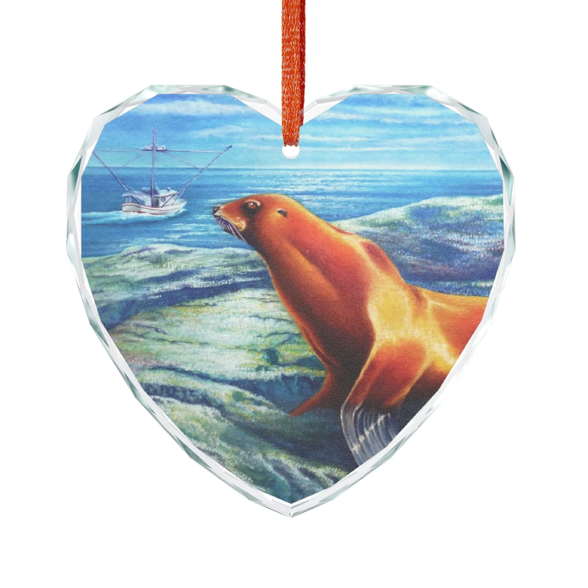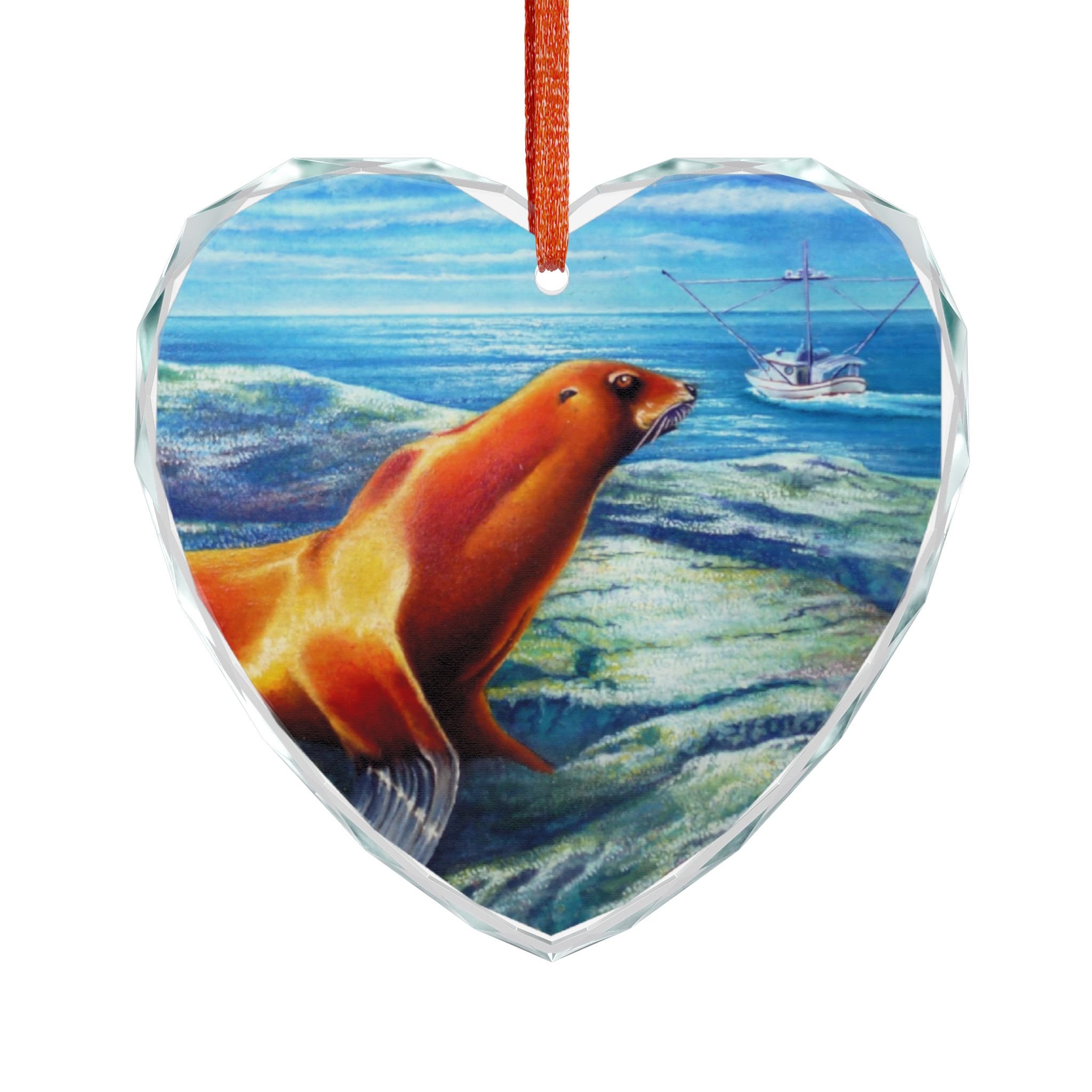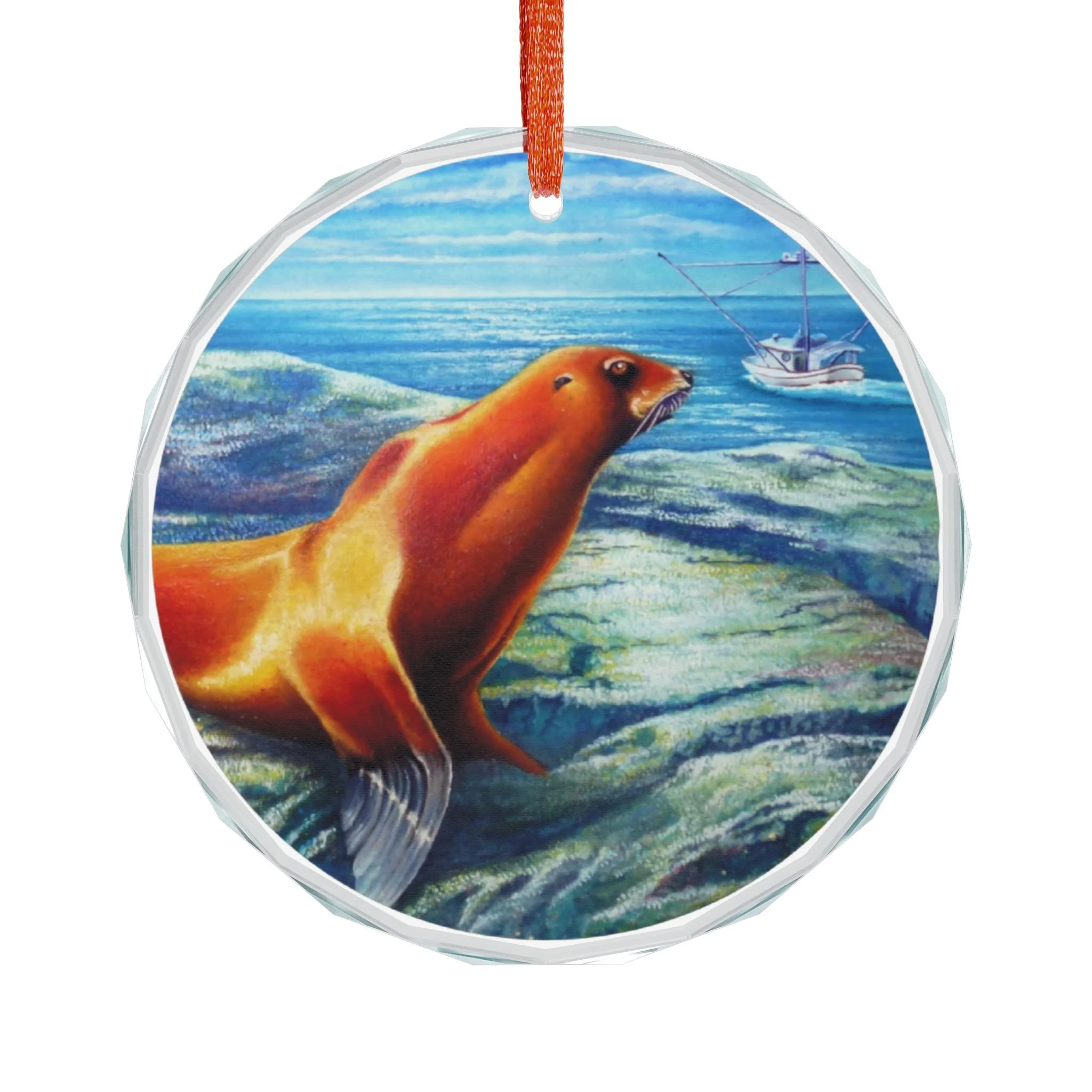 A luminous crystal glass ornament that catches the light and brings a coastal moment into the home. The faceted edges throw tiny rainbows while the vibrant one-sided print shows a warm-toned sea lion perched on rocky shorelines with fishing boats beyond — a quiet snapshot of seaside life. Hung by the included red ribbon, it adds a reflective, nostalgic touch to mantels, windows, or holiday greenery. This piece feels like a keepsake from a foggy harbor morning: salty air, creaking boats, and the steady presence of marine life nearby.