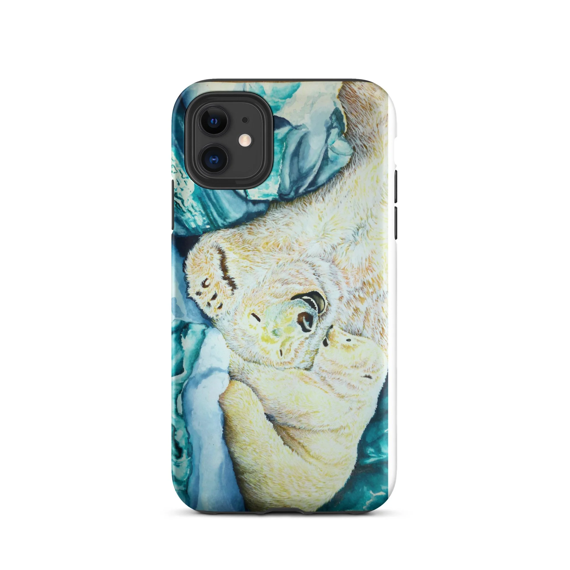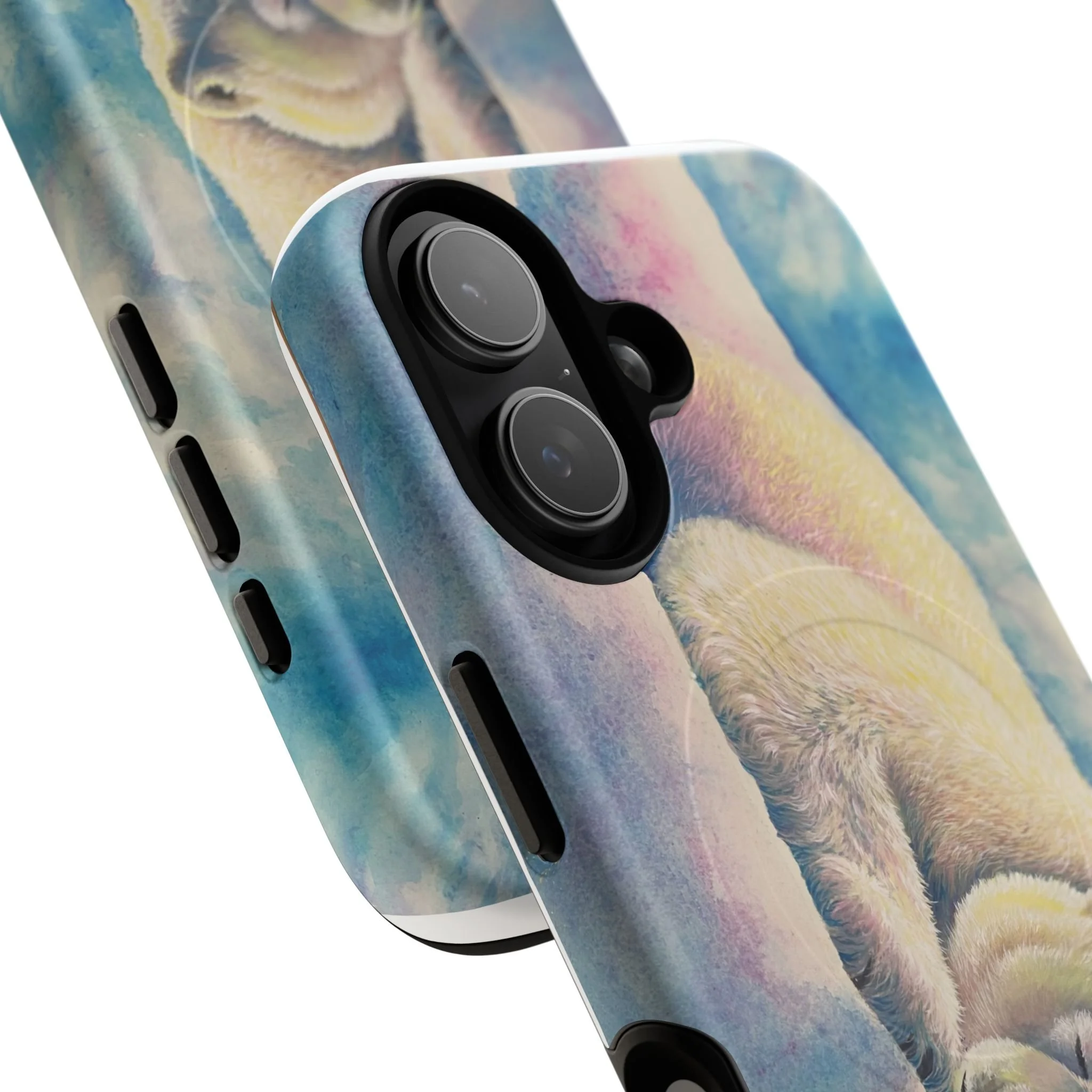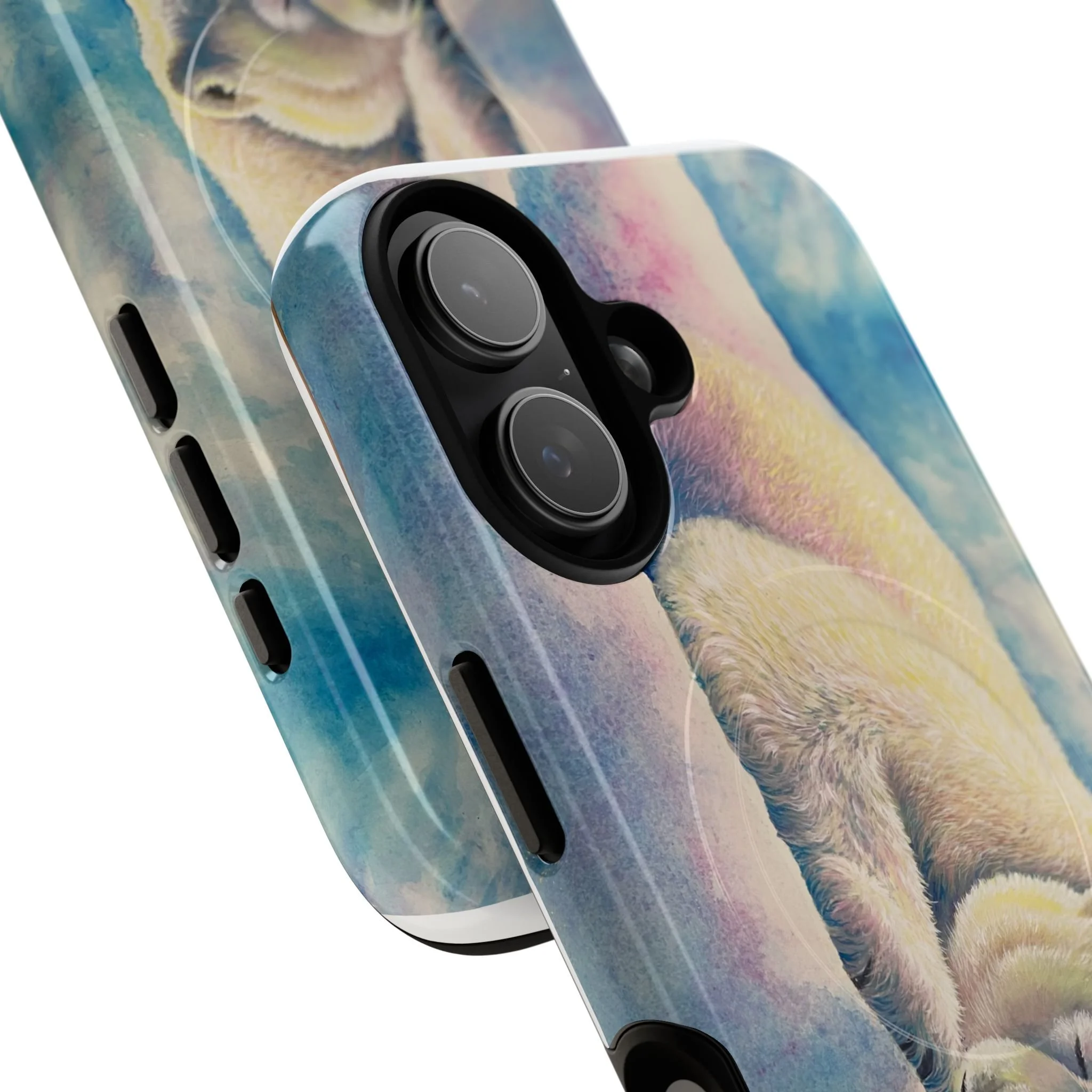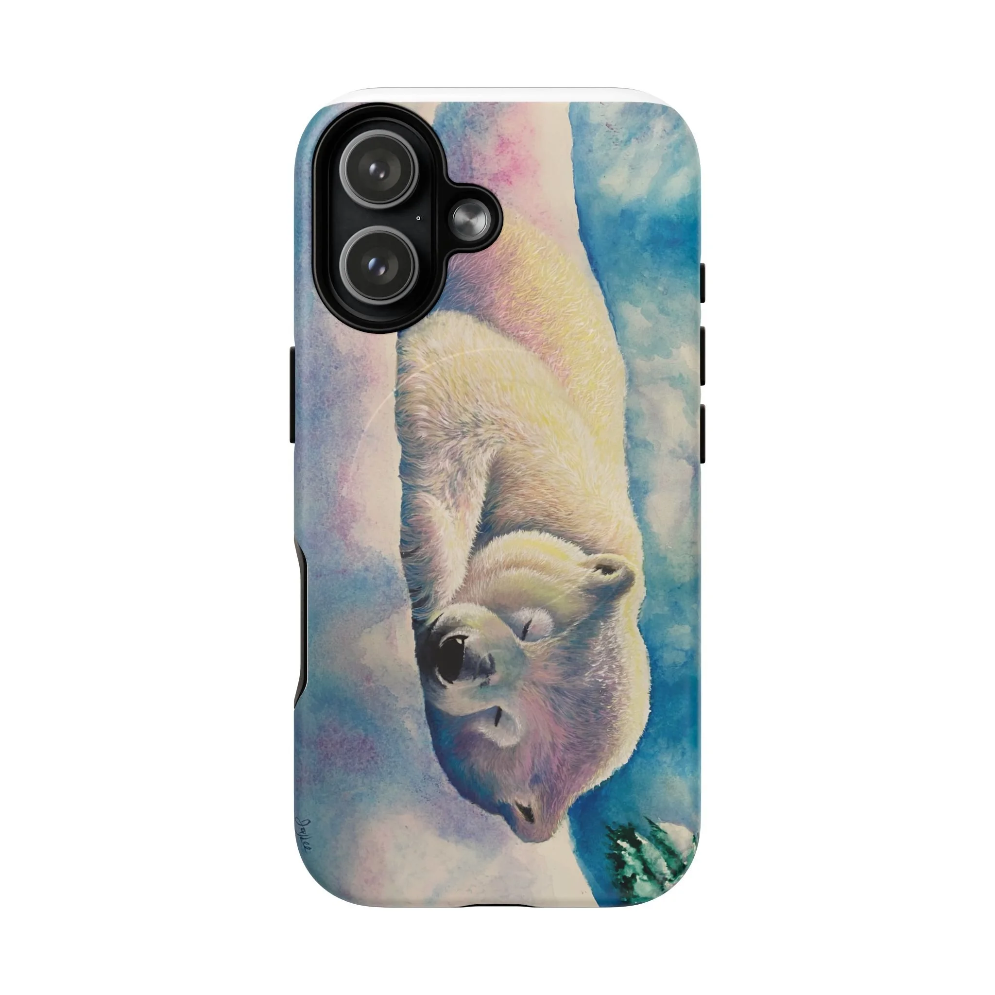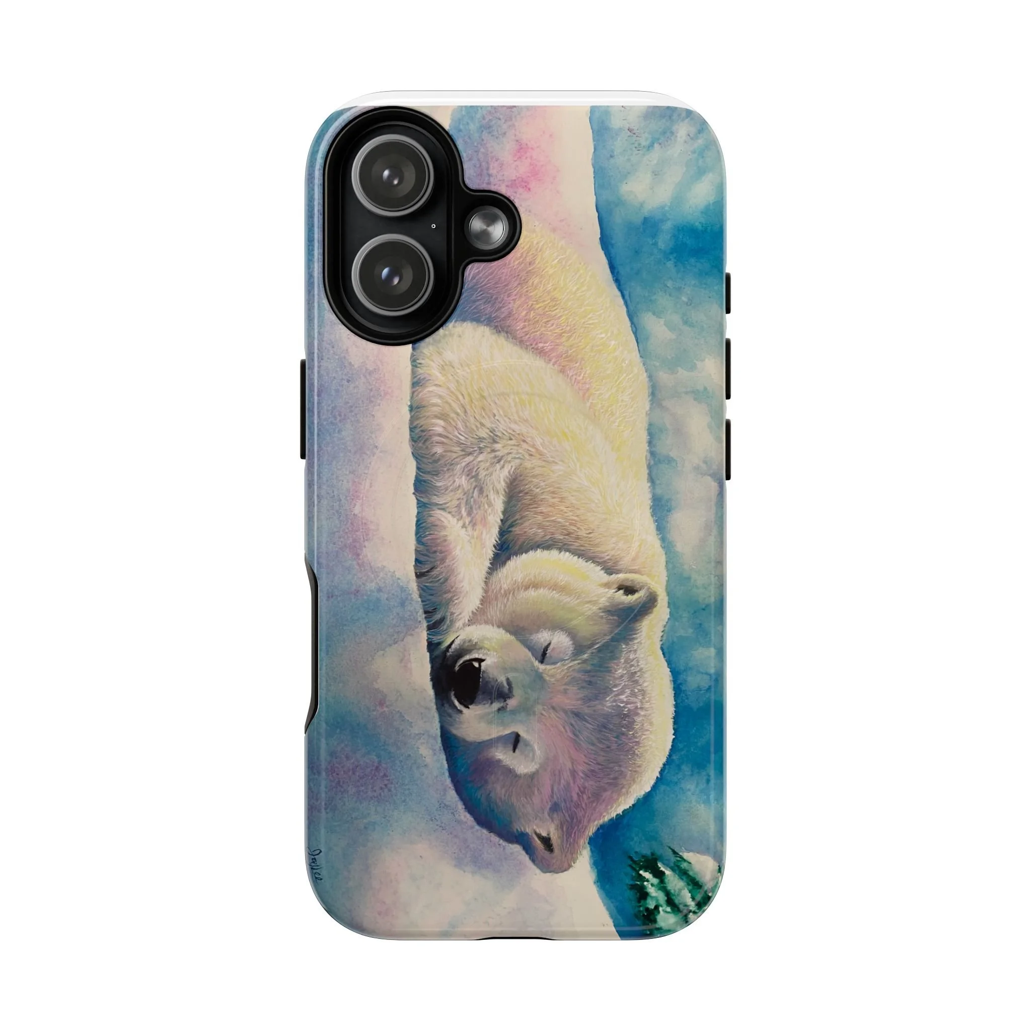 iPhone with a case featuring a painting of a white polar bear lying on ice, with a blue sky in the background.
