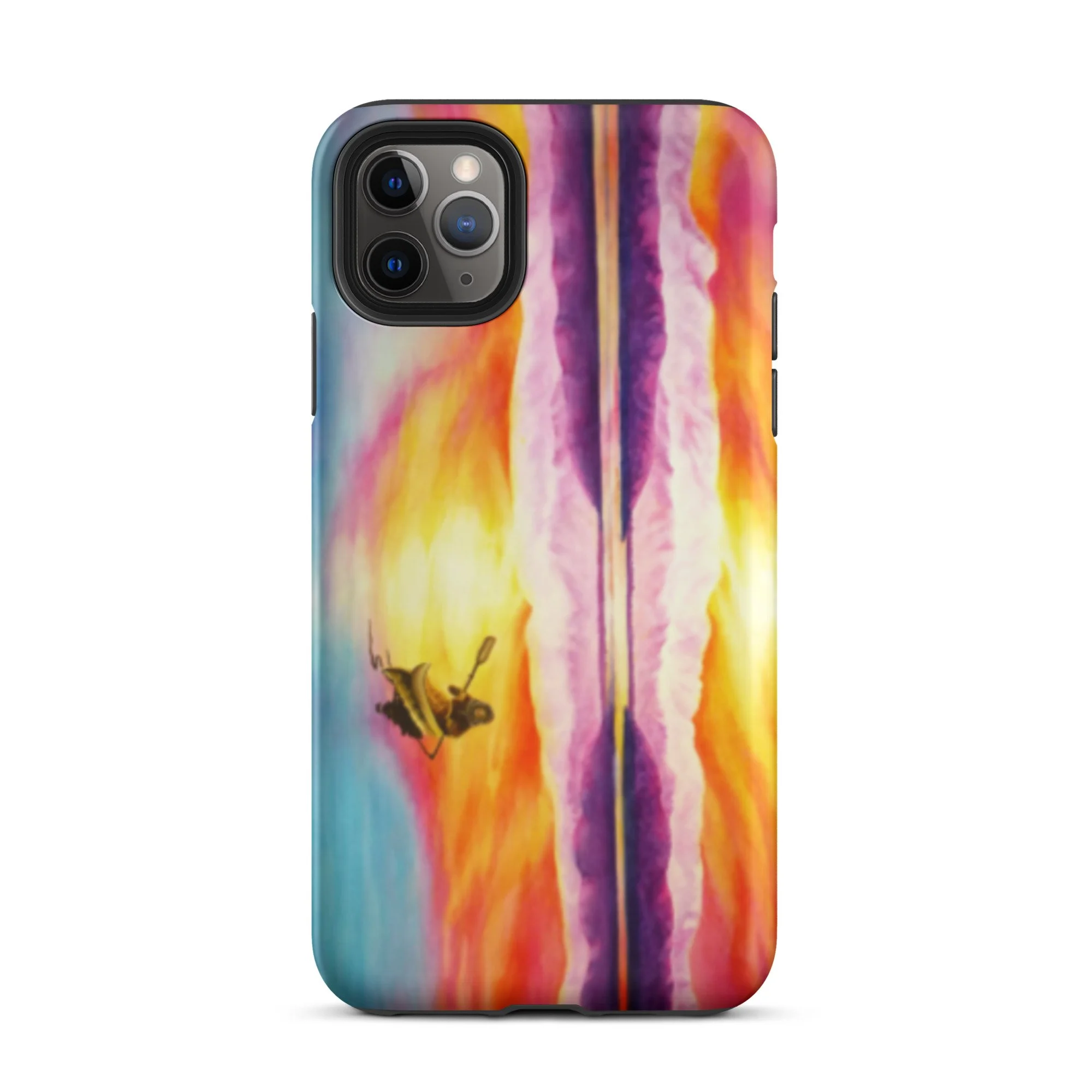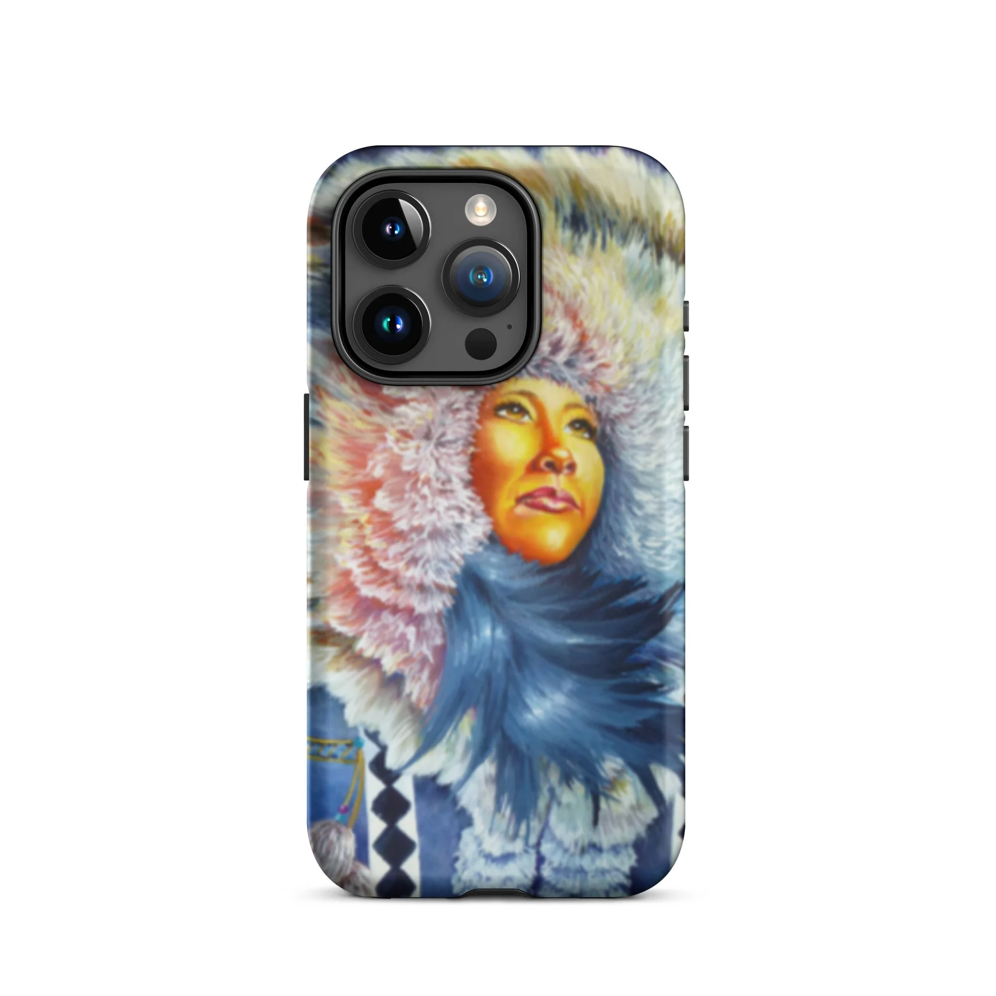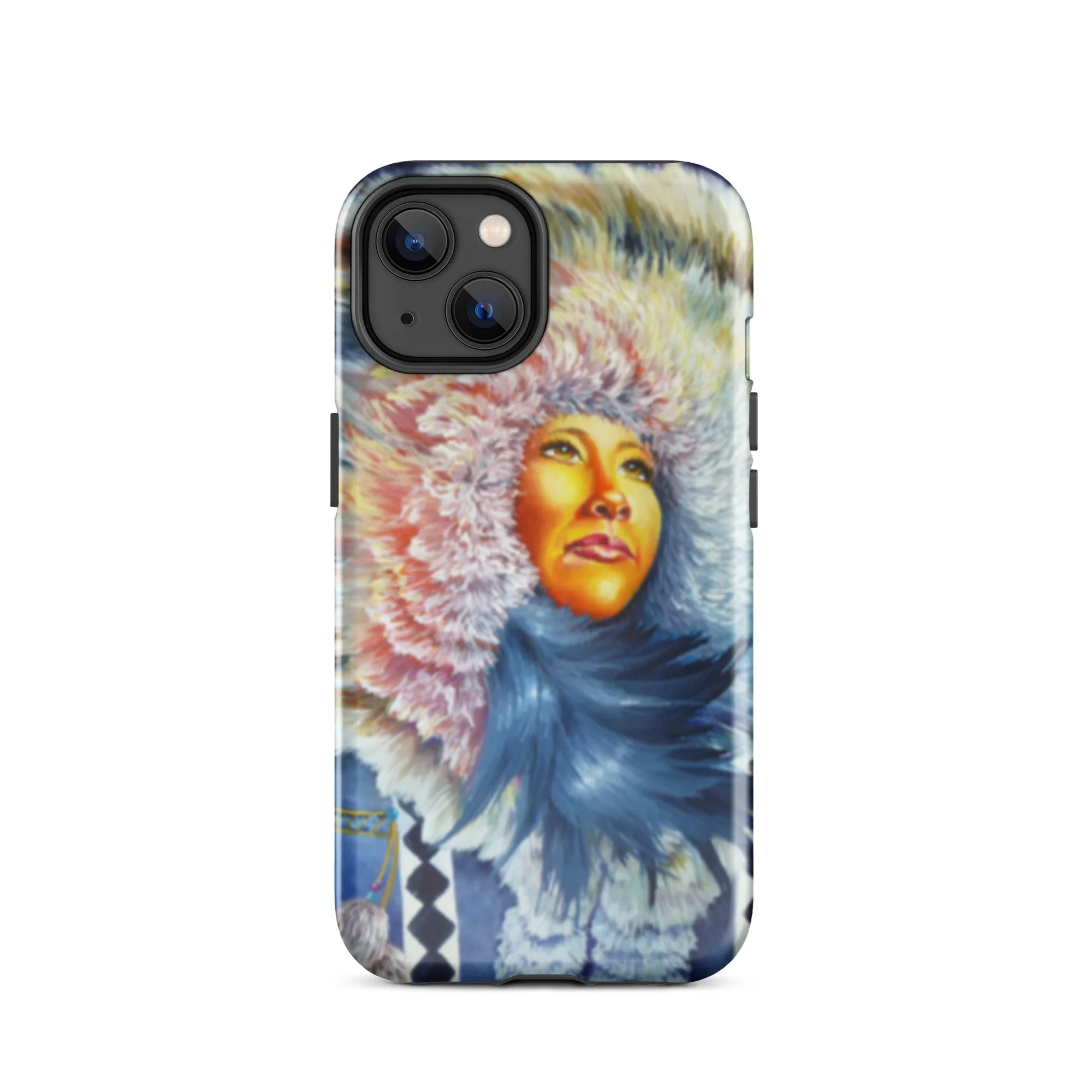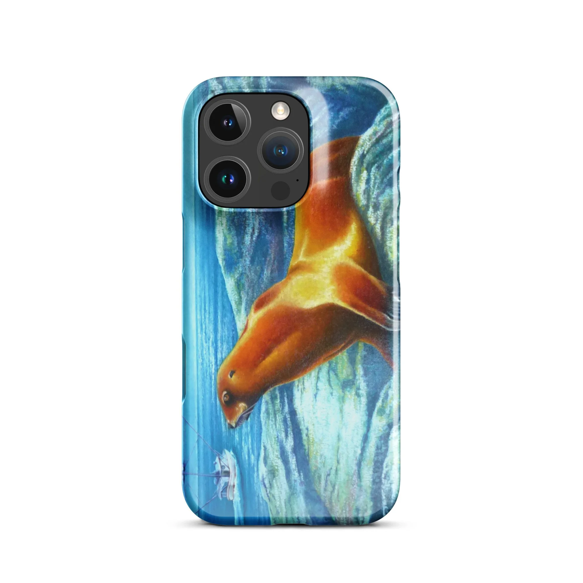 iPhone with a case featuring a painting of a white polar bear lying on ice, with a blue sky in the background.