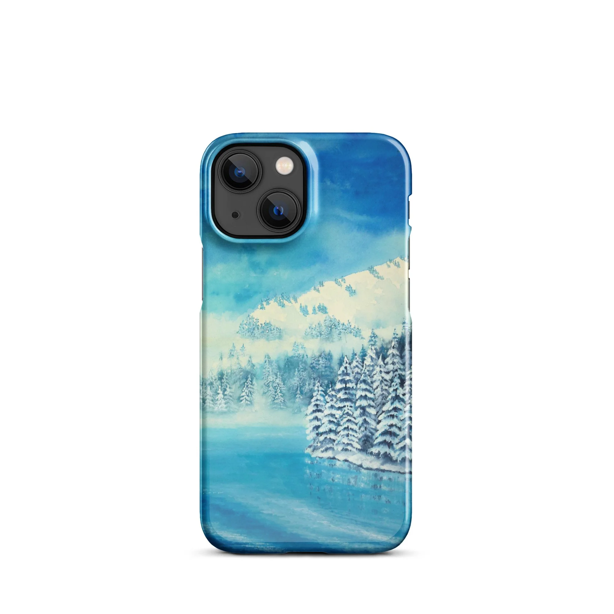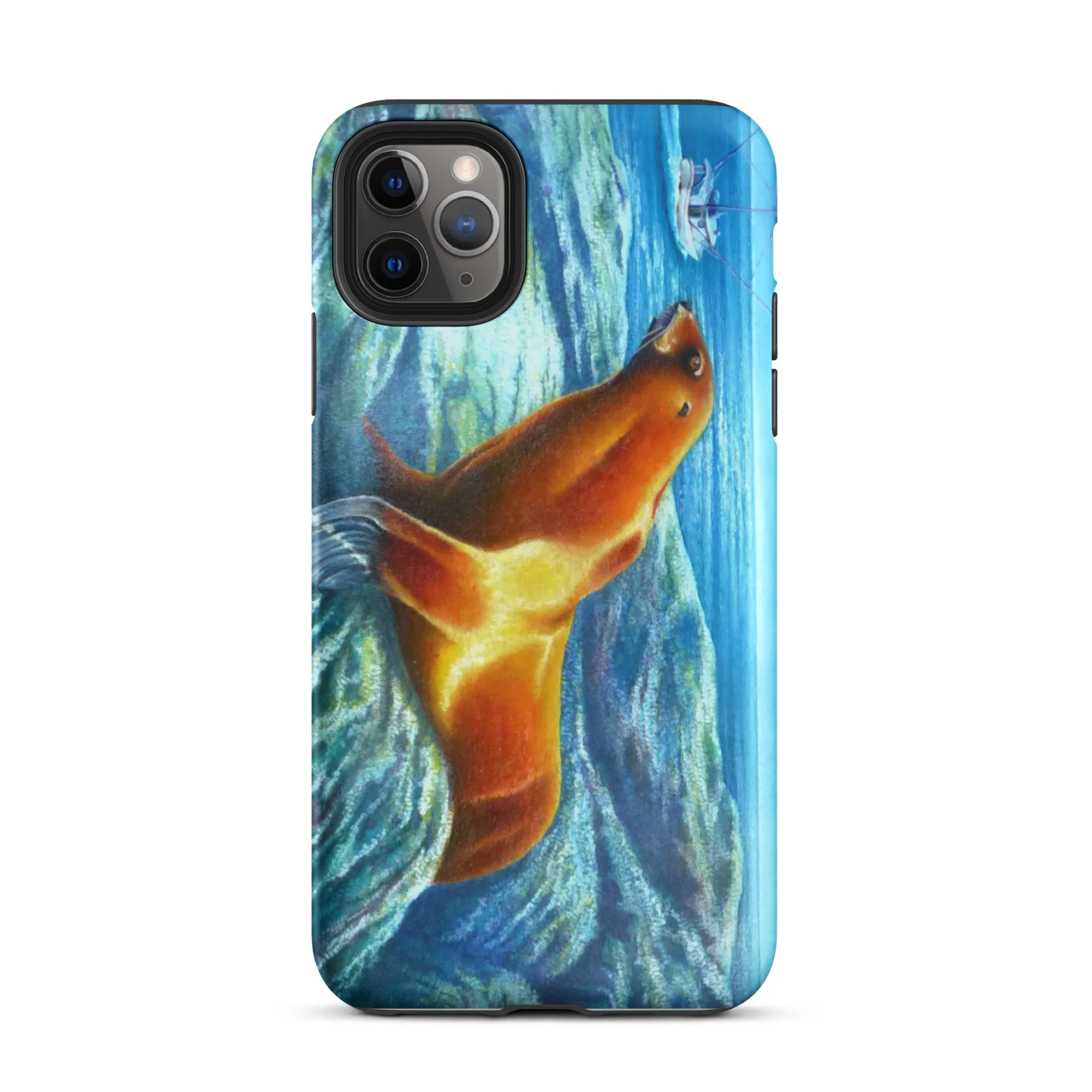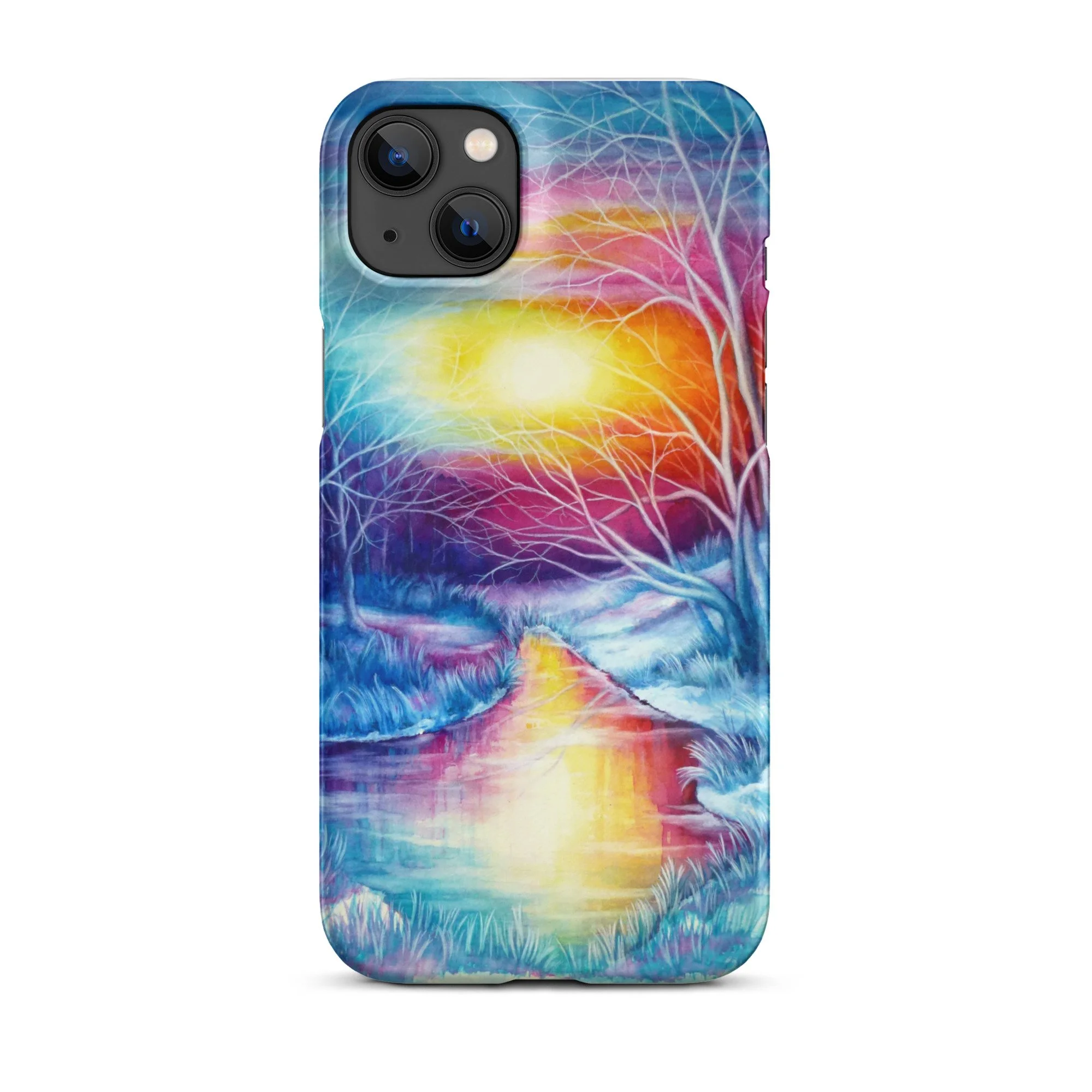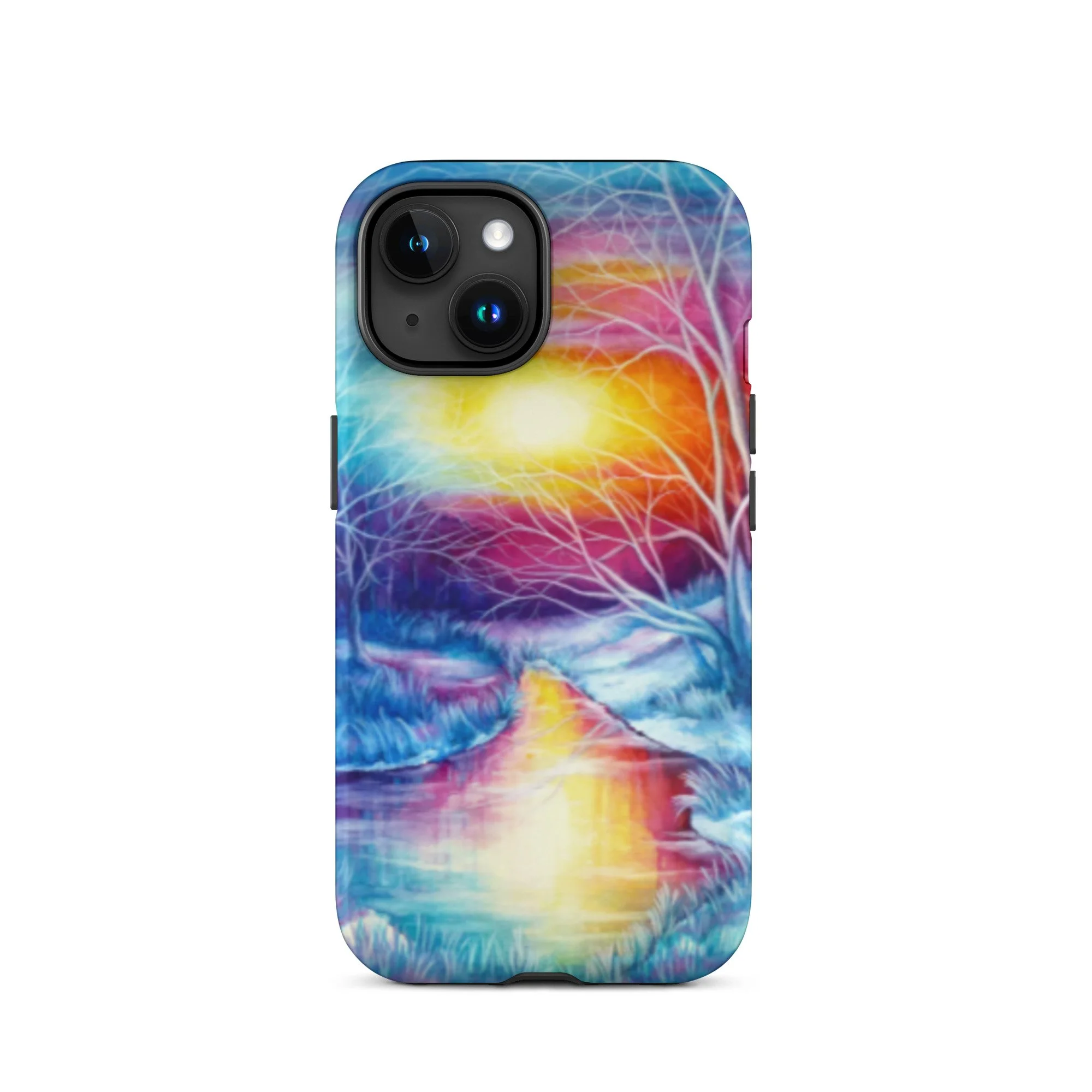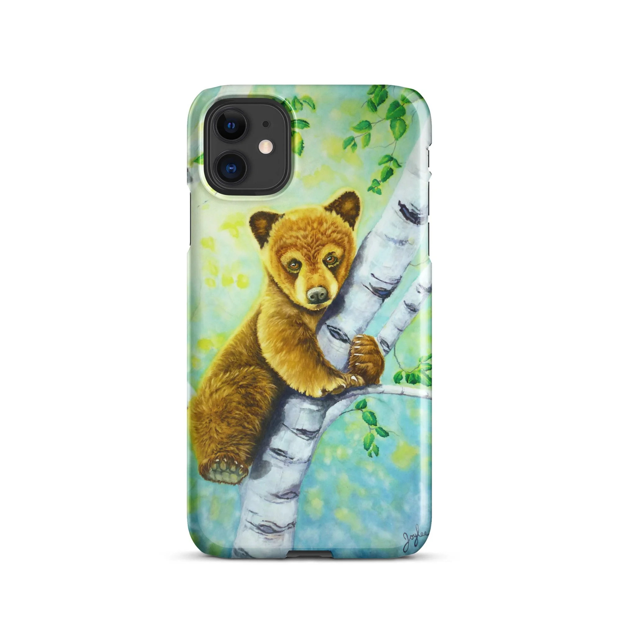 iPhone with a case featuring a painting of a white polar bear lying on ice, with a blue sky in the background.