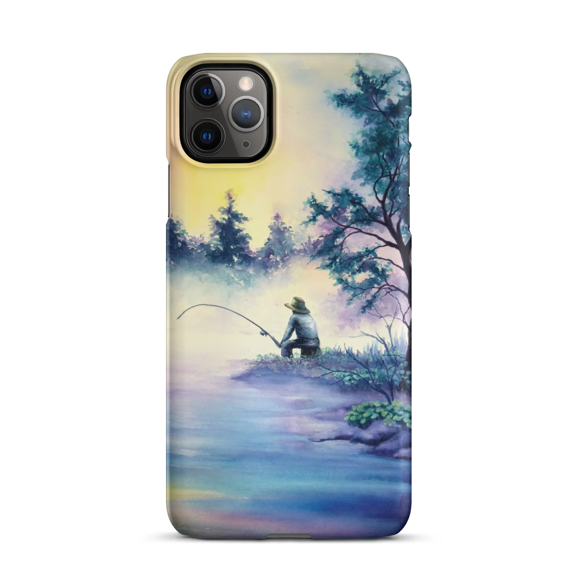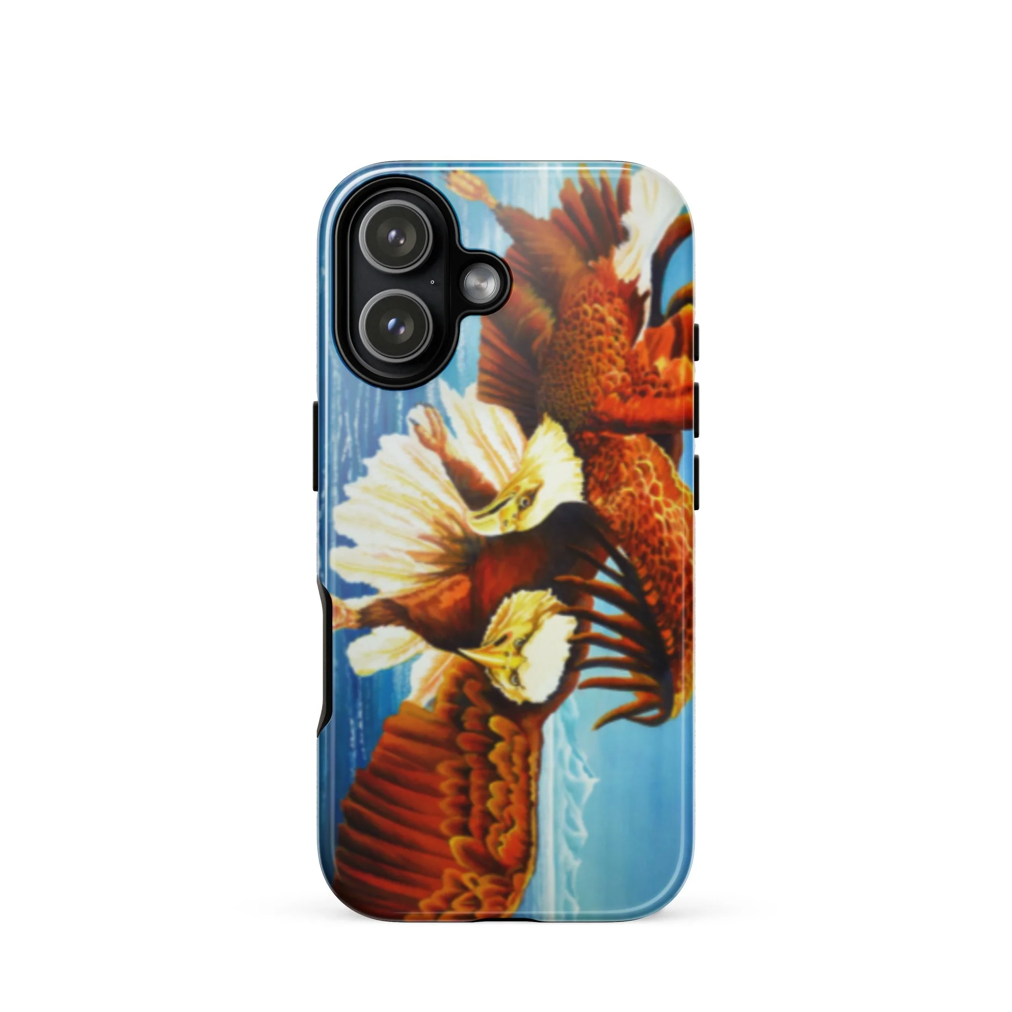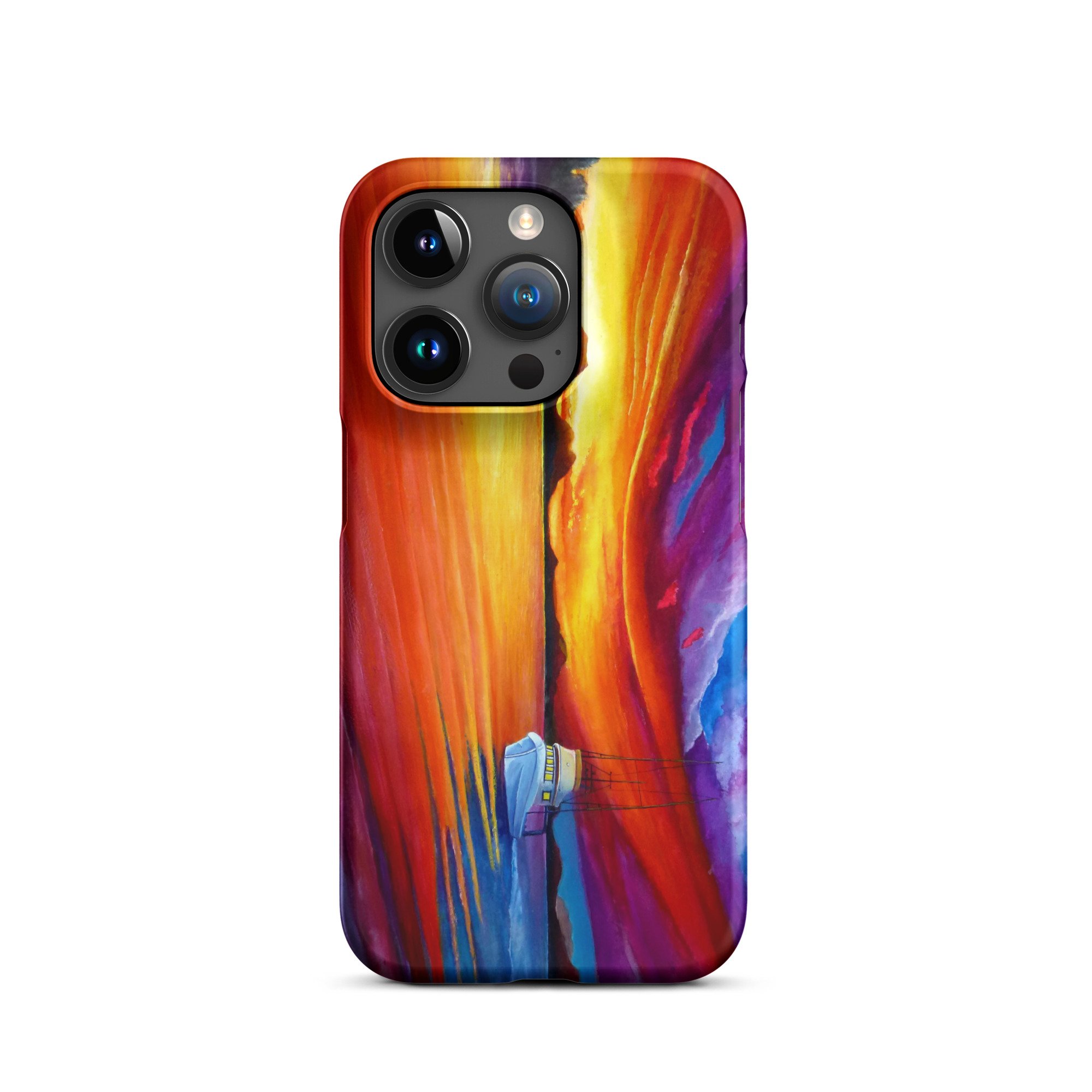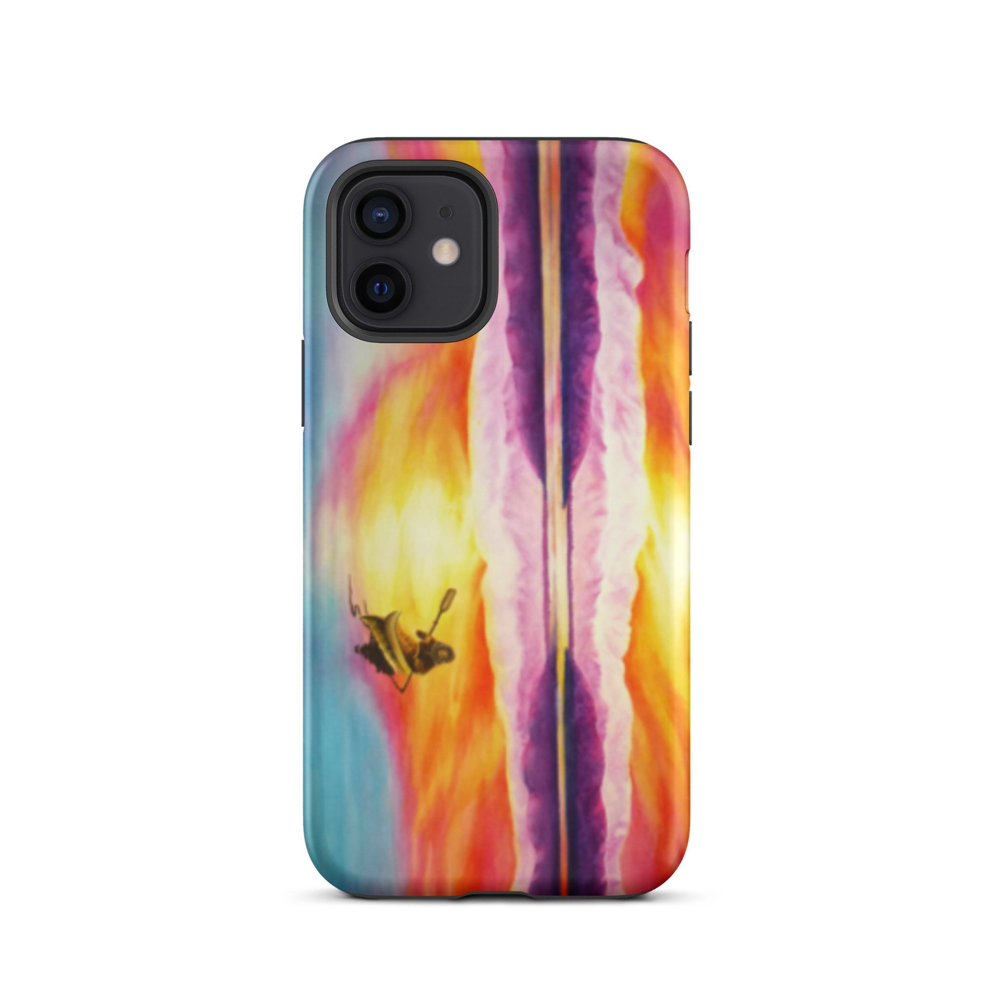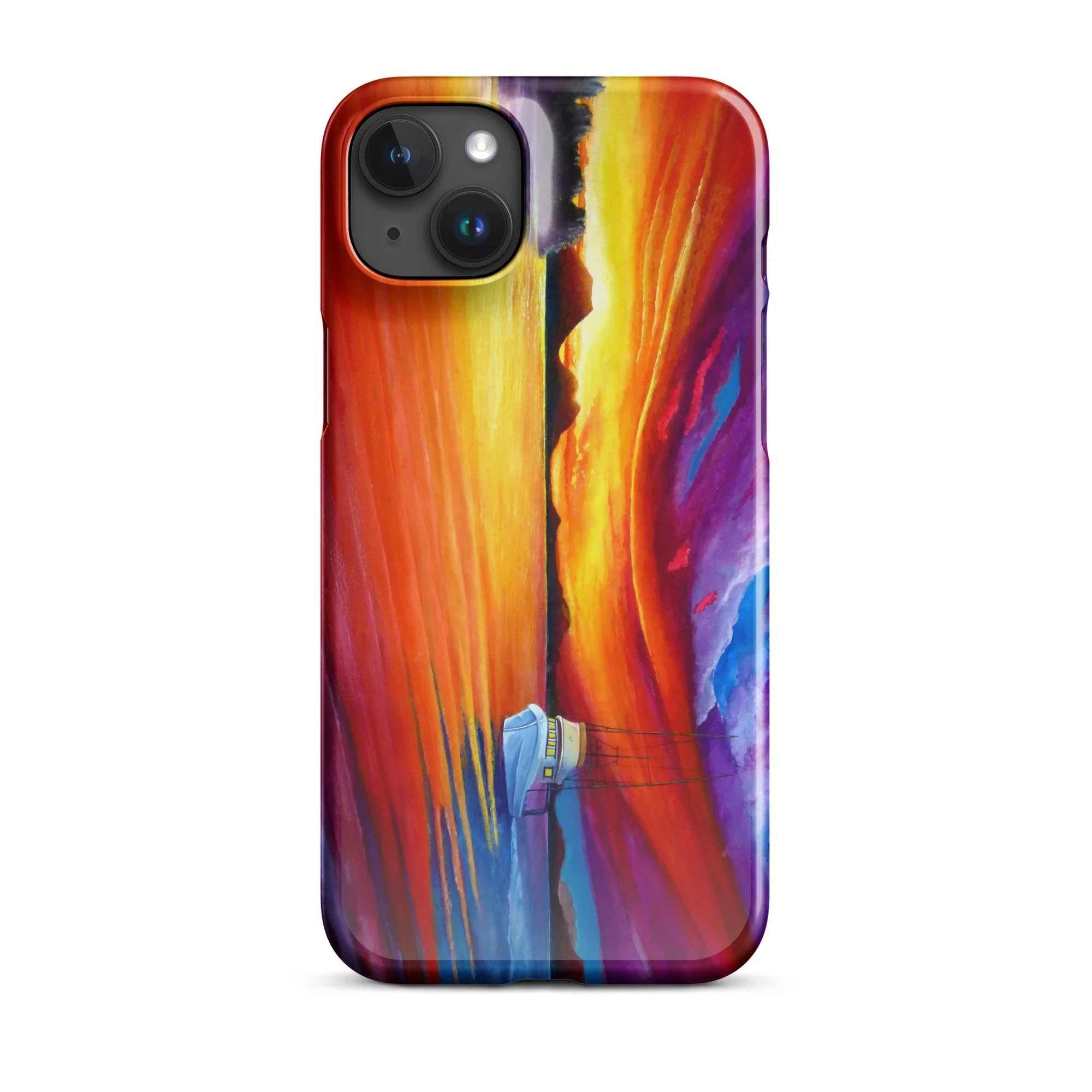 iPhone with a case featuring a painting of a white polar bear lying on ice, with a blue sky in the background.