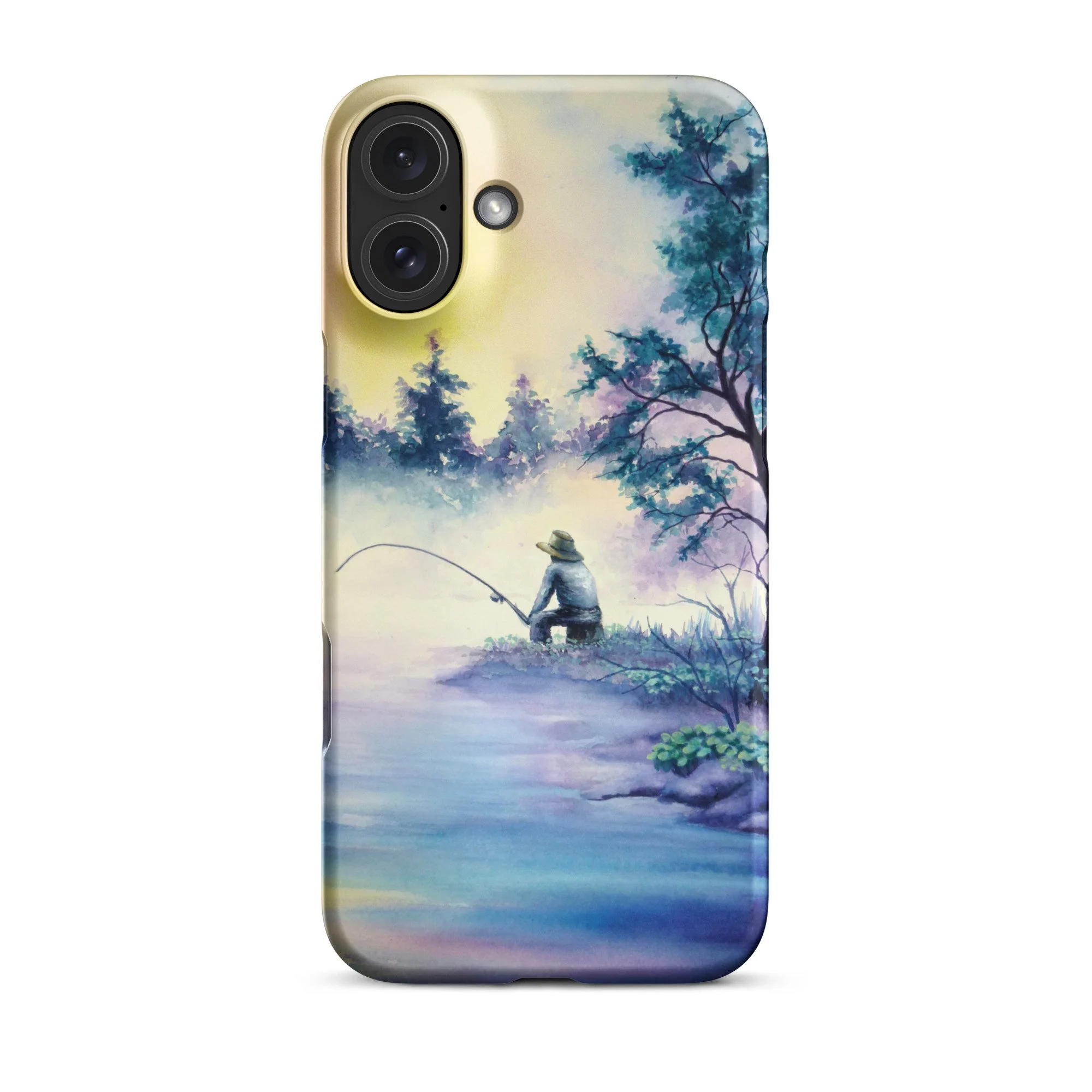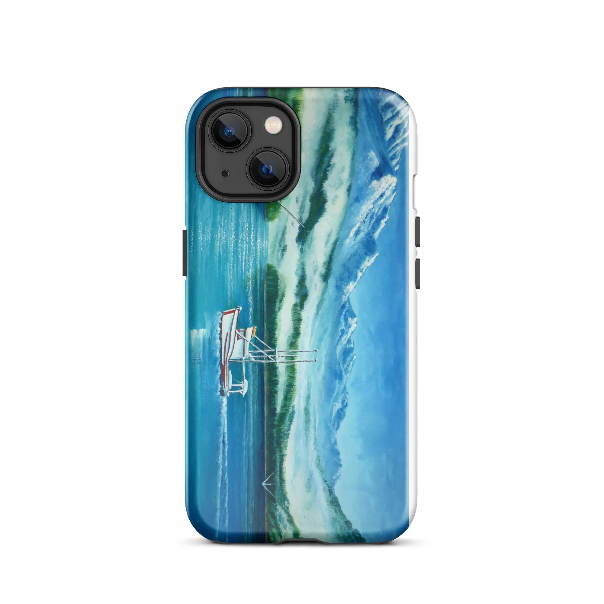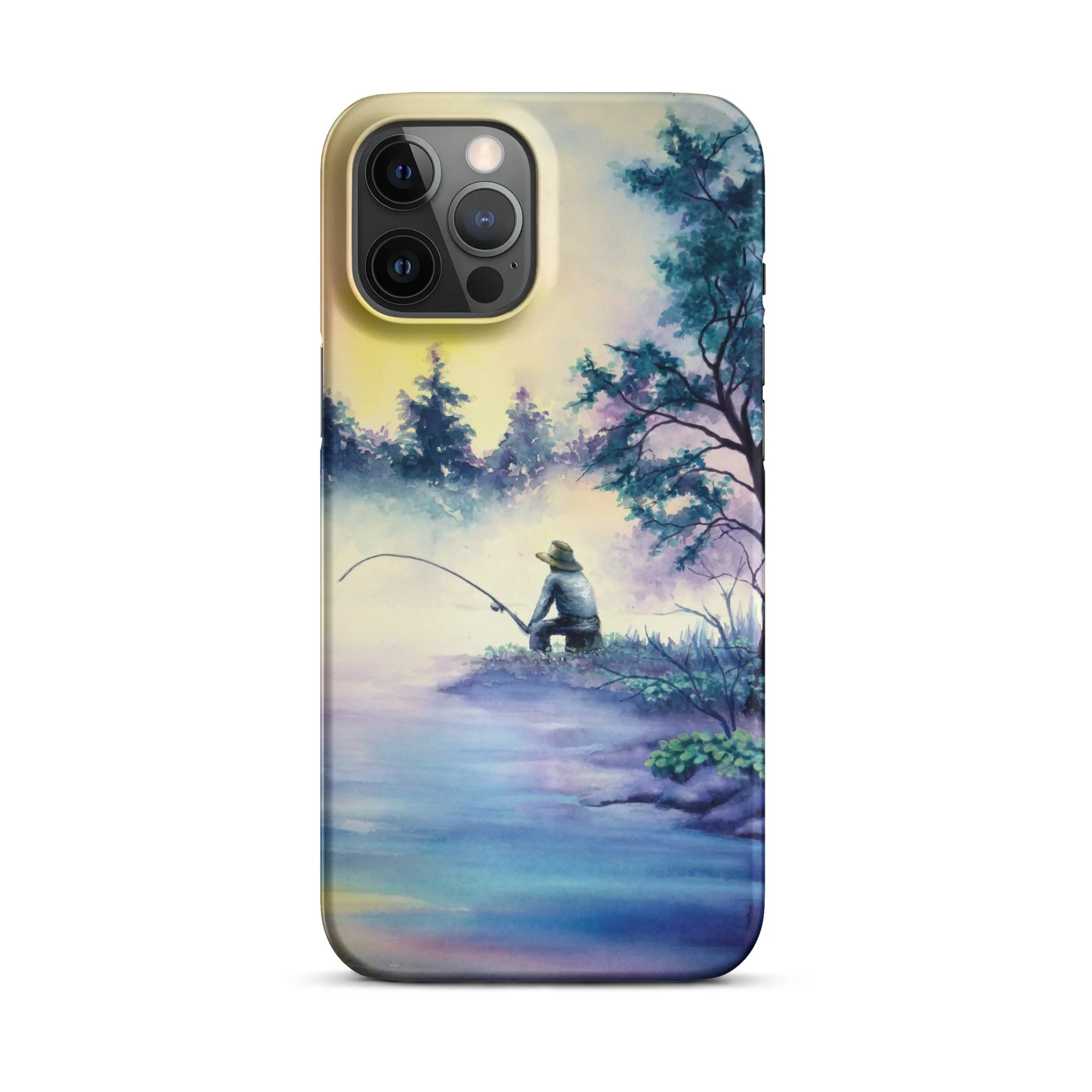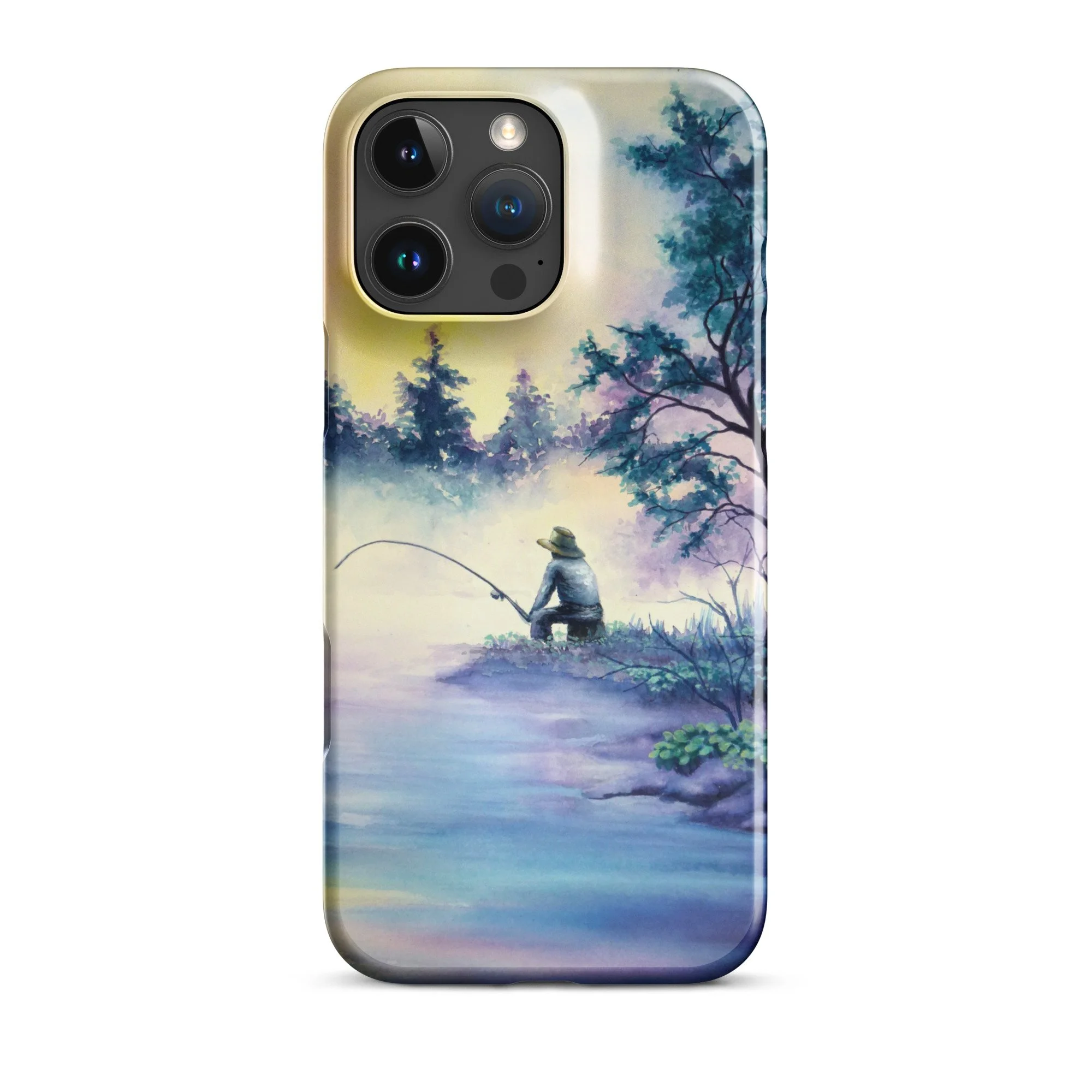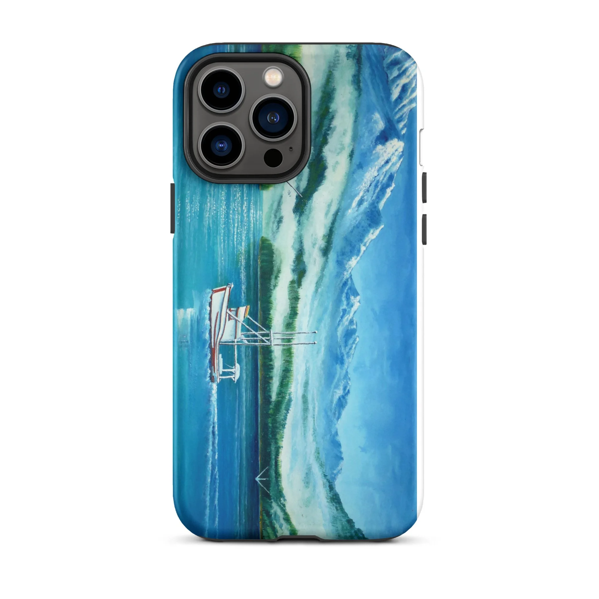 iPhone with a case featuring a painting of a white polar bear lying on ice, with a blue sky in the background.