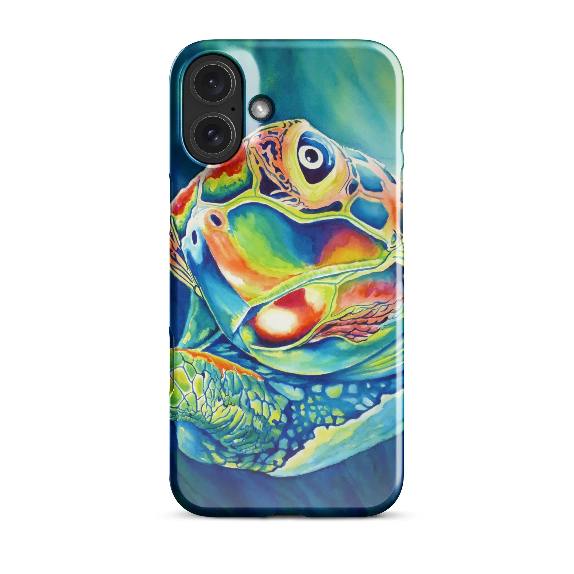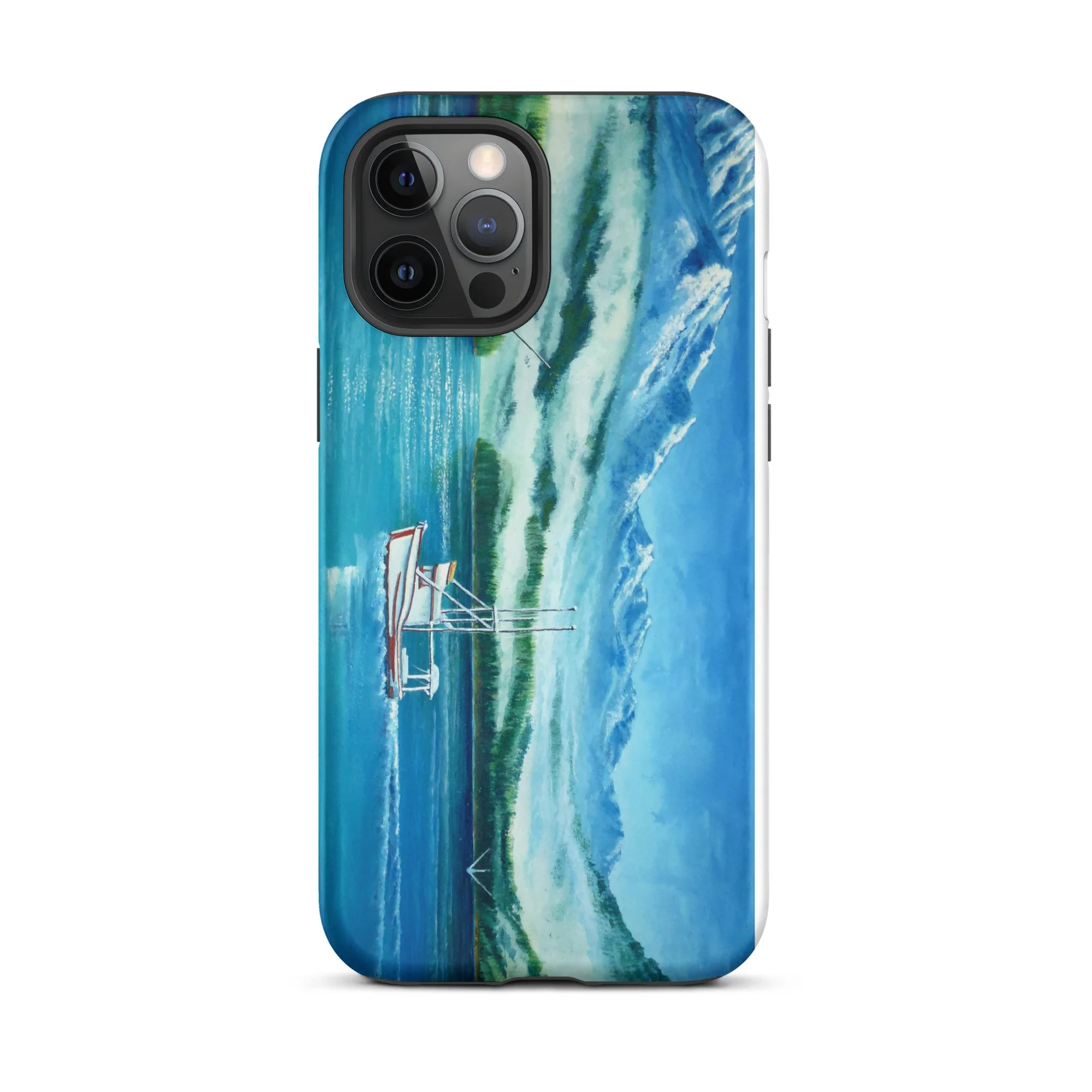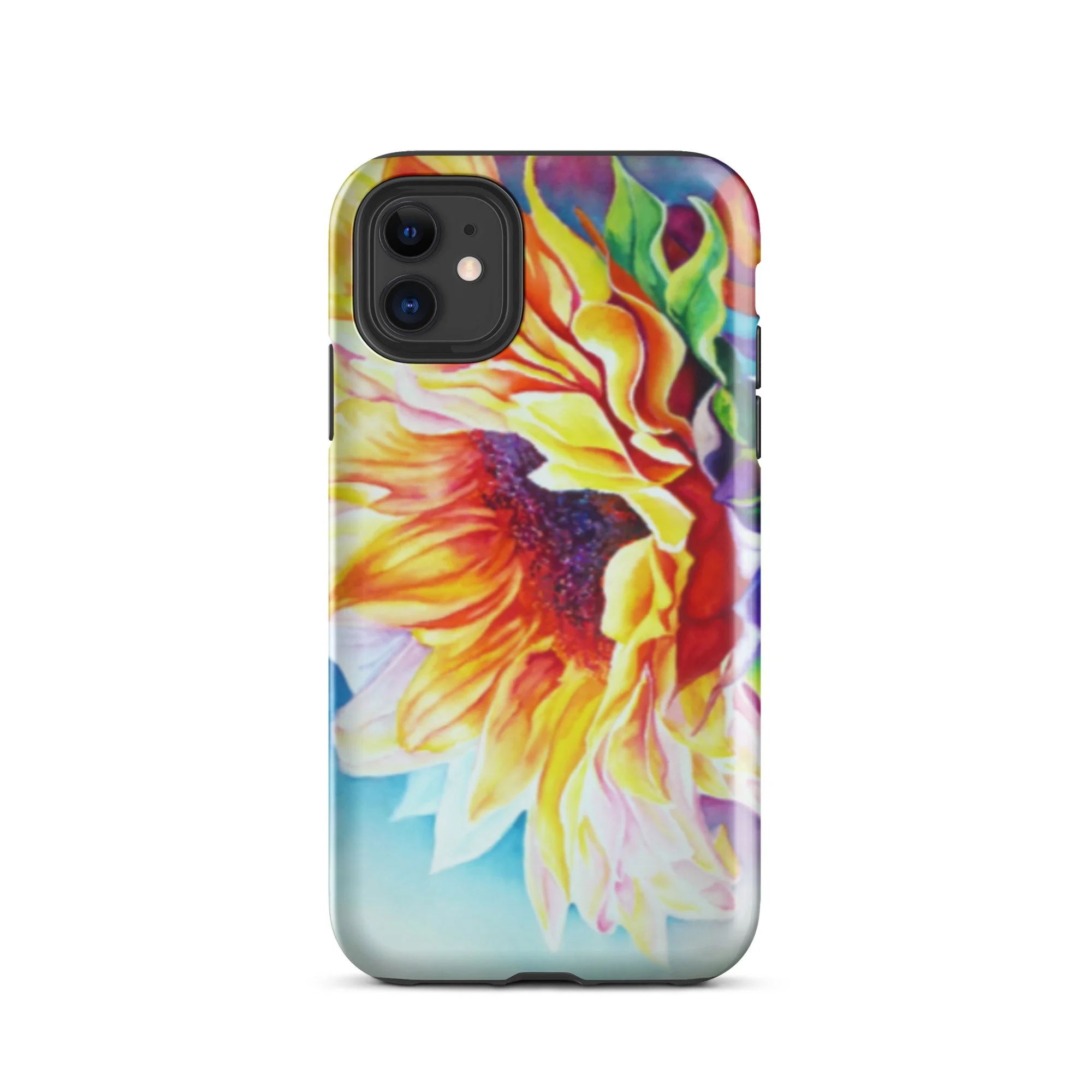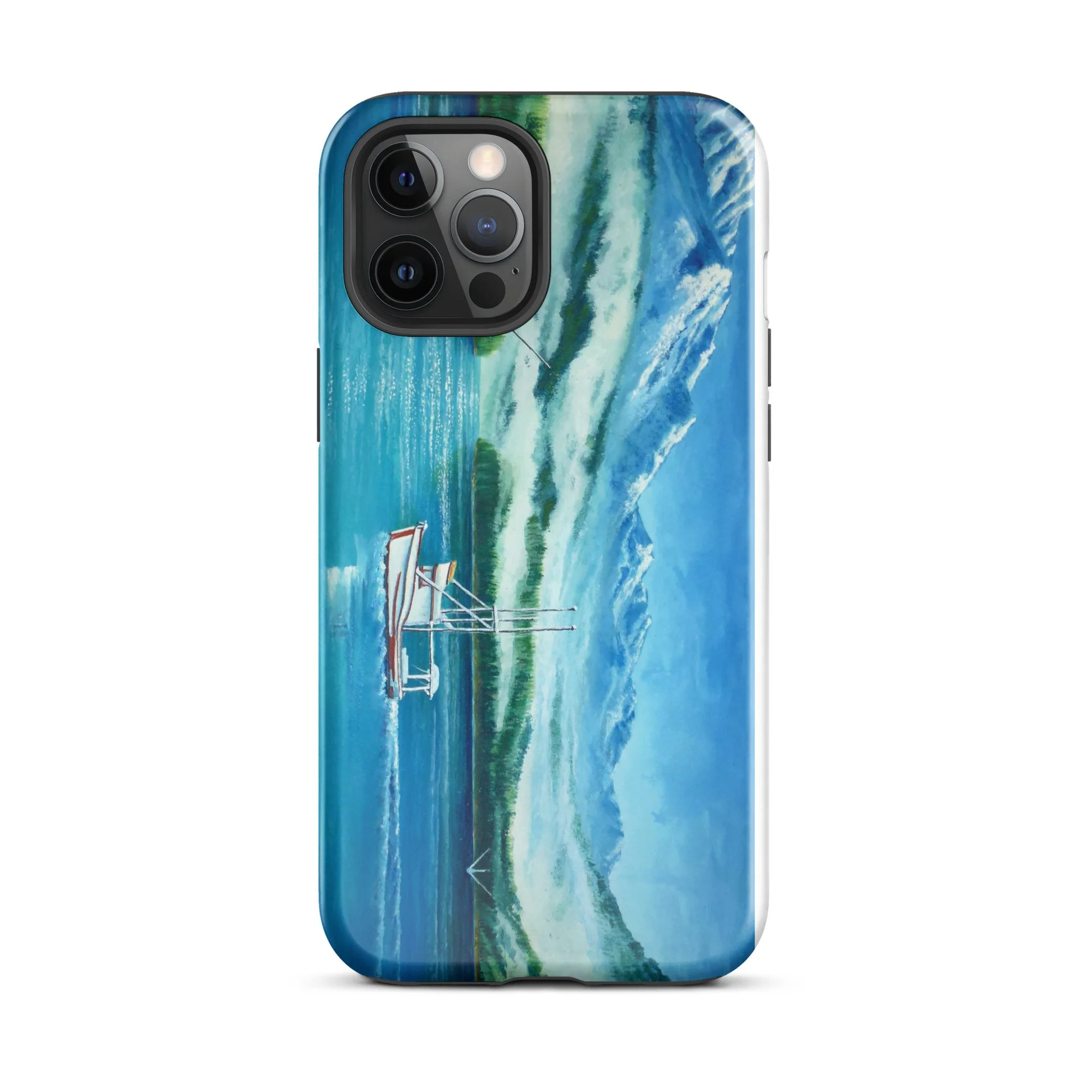 iPhone with a case featuring a painting of a white polar bear lying on ice, with a blue sky in the background.
