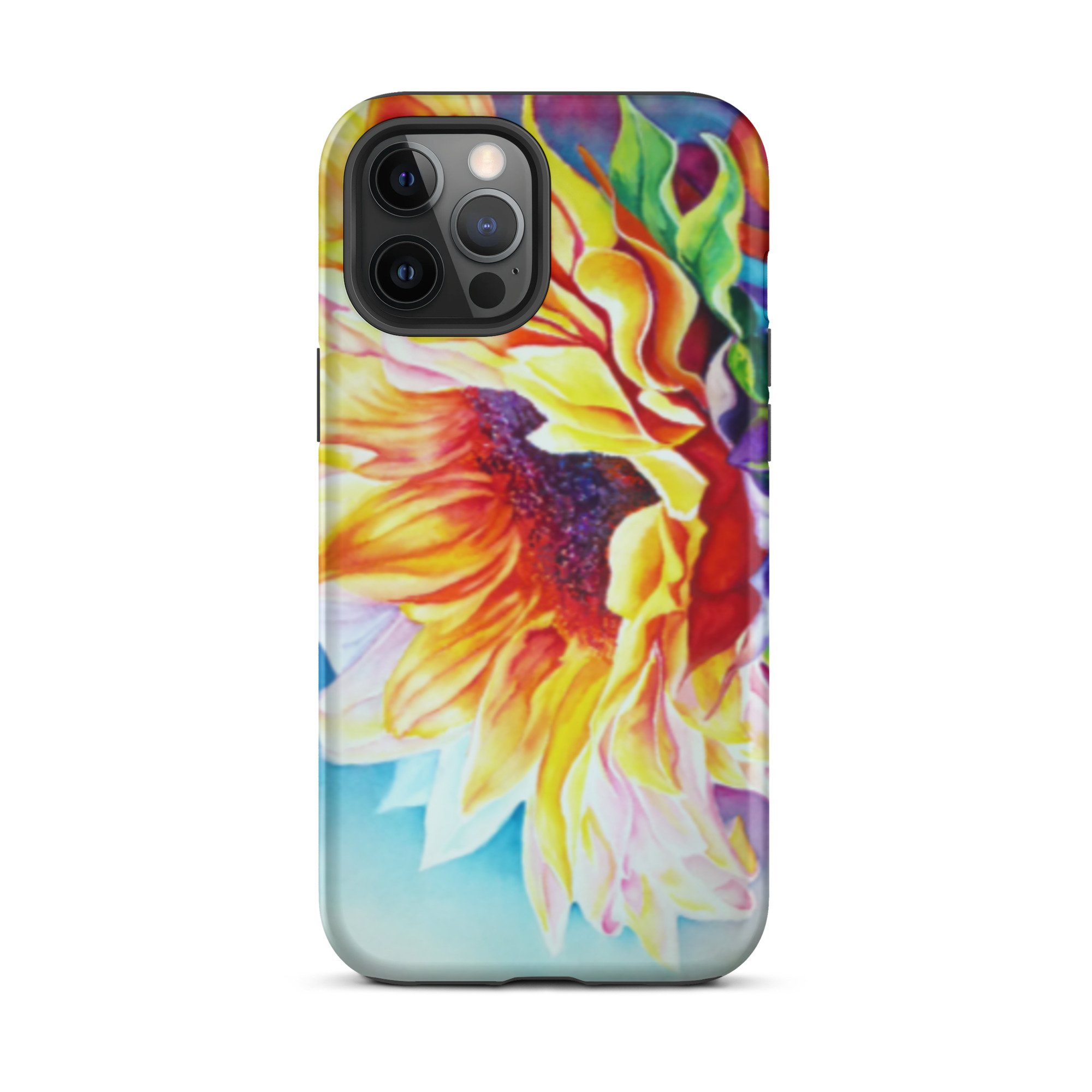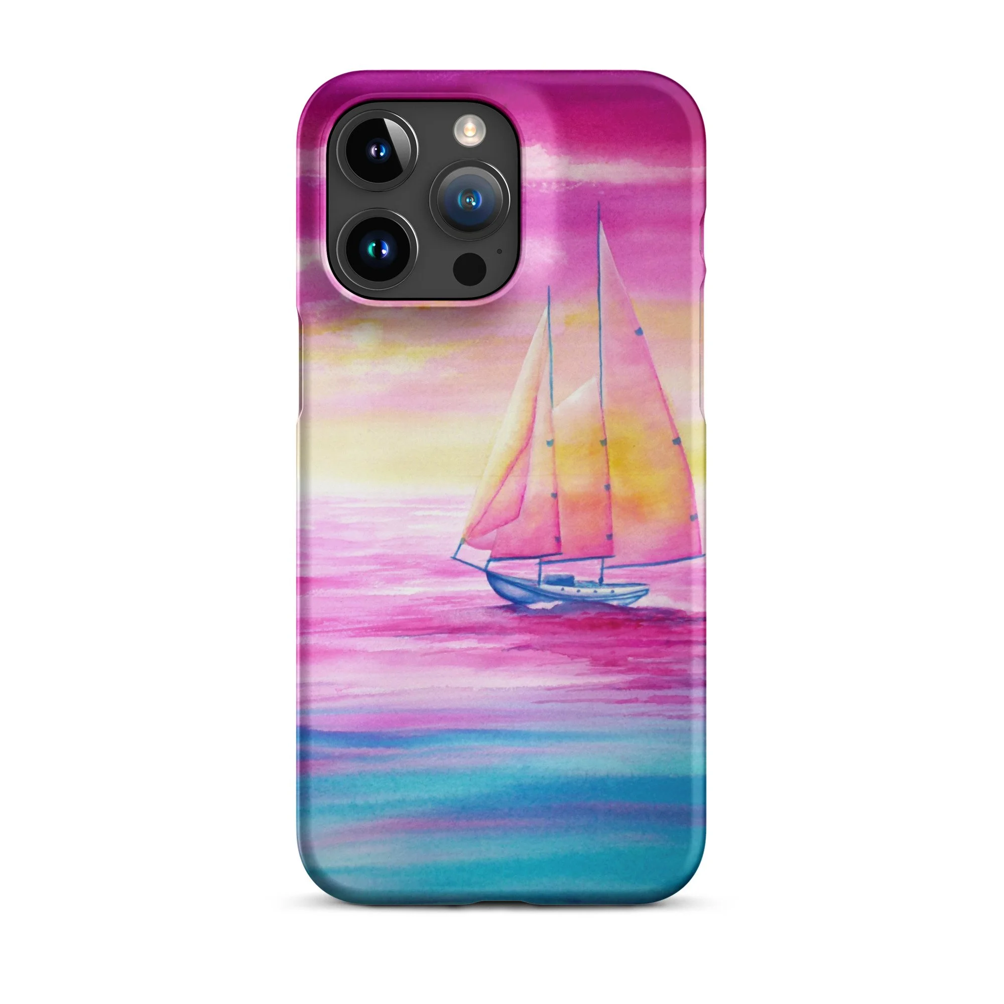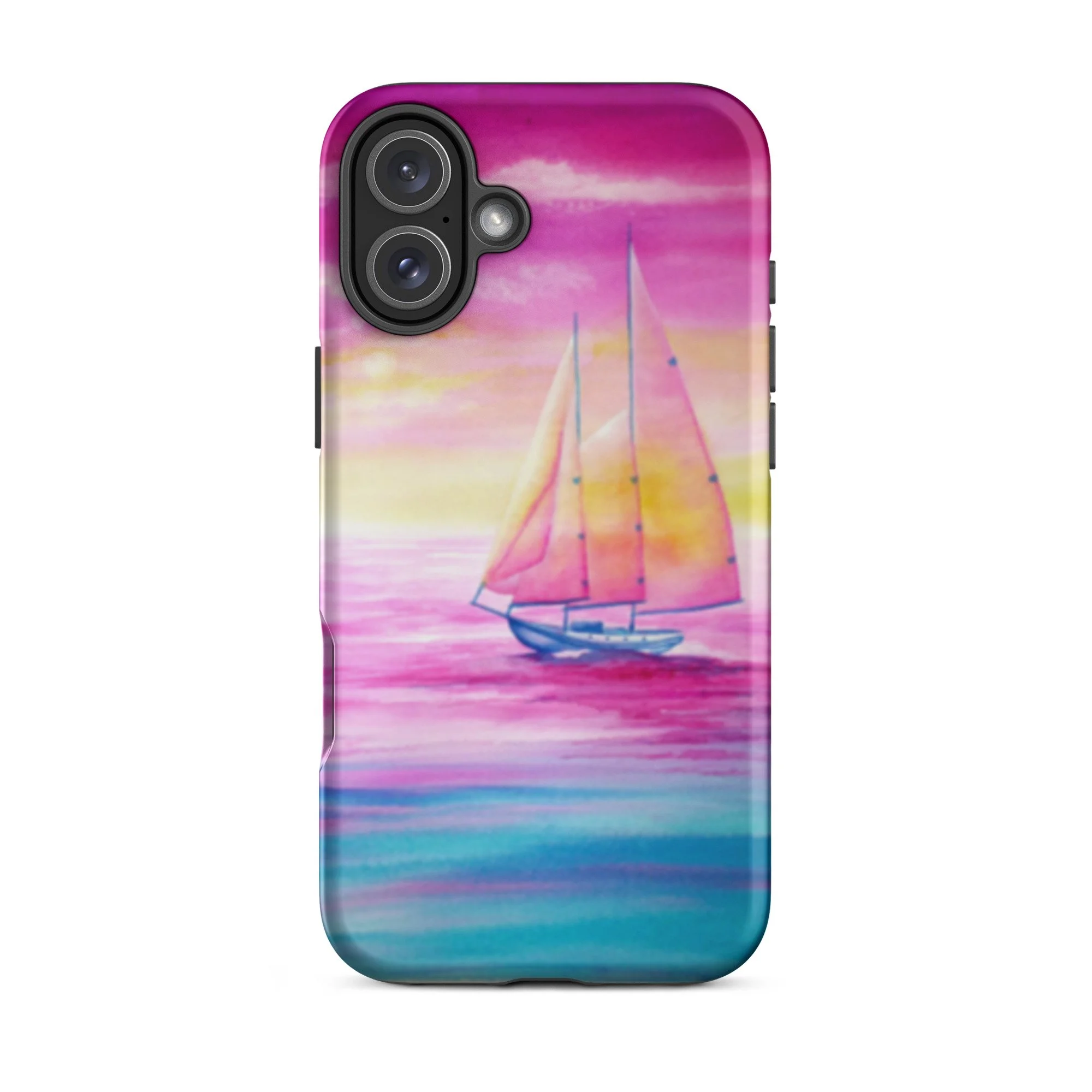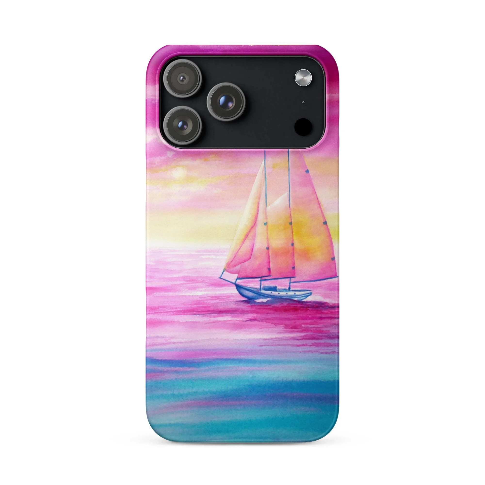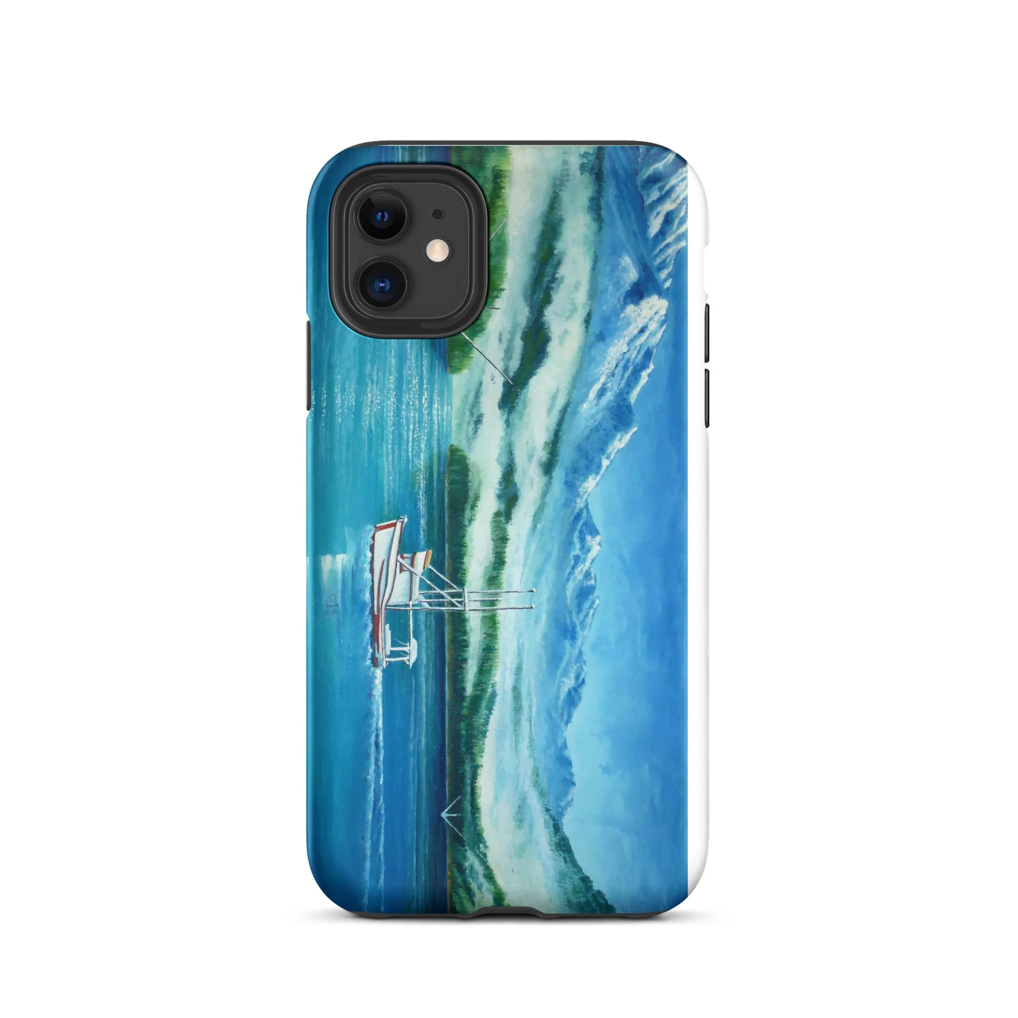 iPhone with a case featuring a painting of a white polar bear lying on ice, with a blue sky in the background.